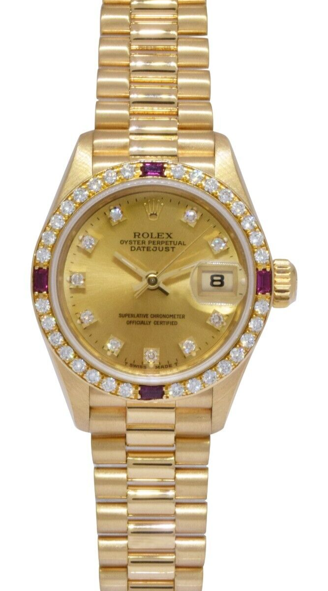 This Rolex Datejust Lady 69068 has a champagne diamond dial and a bracelet strap. This Rolex has undergone a thorough inspection of water resistance, accuracy, functionality and condition to determine the level of reconditioning required to meet our strict standards. It has also been referenced against technical documents and manufacturer records where available to ensure authenticity and a clean history. All our watches have a 24-month warranty for your peace of mind. One of our skilled polishing technicians has removed marks on the case and bracelet of this watch, brought about by daily wear and tear, which is why this watch does not come with the remaining manufacturer’s warranty.