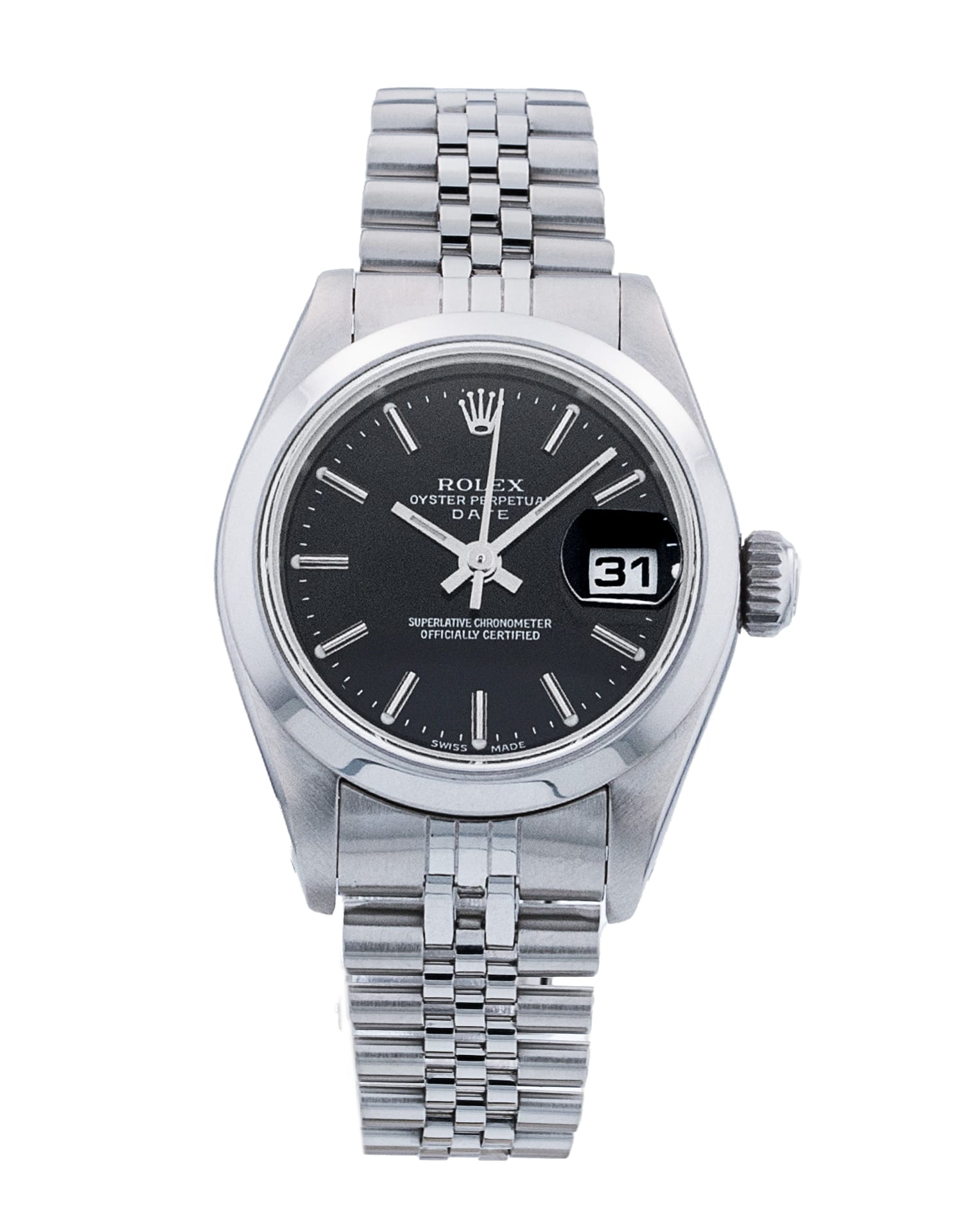 This Rolex Datejust Lady 69160 has a black baton dial and a bracelet strap. This Rolex has undergone a thorough inspection of water resistance, accuracy, functionality and condition to determine the level of reconditioning required to meet our strict standards. It has also been referenced against technical documents and manufacturer records where available to ensure authenticity and a clean history. Our watches have a 24-month warranty for your peace of mind, in conjunction with any remaining manufacturer’s warranty from new or from service. To maintain the manufacturer’s warranty on this watch, it has not been polished in our service centre.