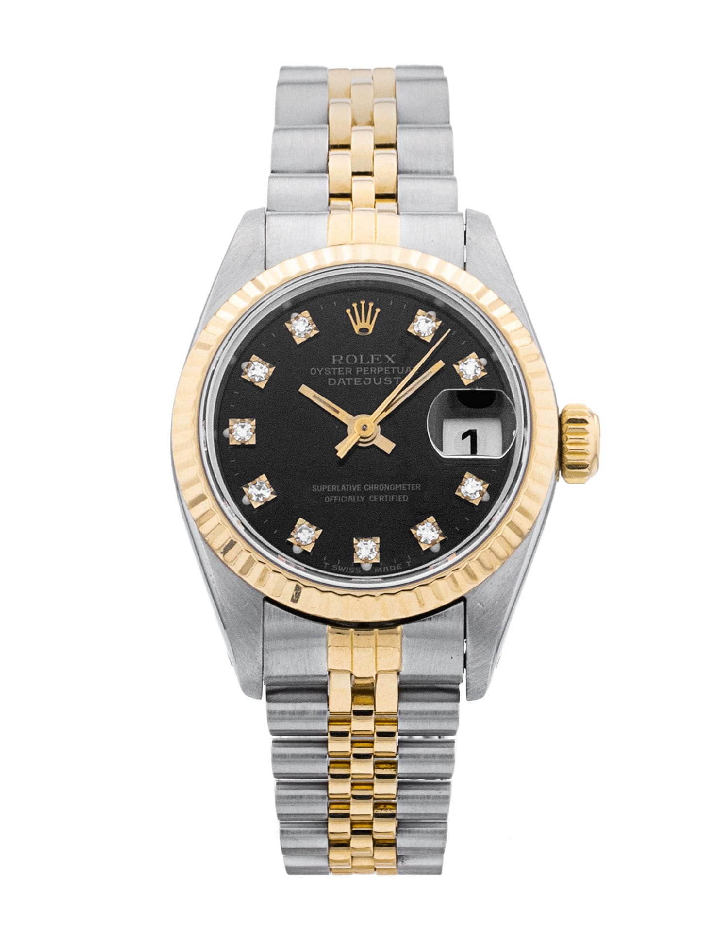 This Rolex Datejust Lady 69173 has a black diamond dial and a bracelet strap. This Rolex has undergone a thorough inspection of water resistance, accuracy, functionality and condition to determine the level of reconditioning required to meet our strict standards. It has also been referenced against technical documents and manufacturer records where available to ensure authenticity and a clean history. All our watches have a 24-month warranty for your peace of mind. One of our skilled polishing technicians has removed marks on the case and bracelet of this watch, brought about by daily wear and tear, which is why this watch does not come with the remaining manufacturer’s warranty.