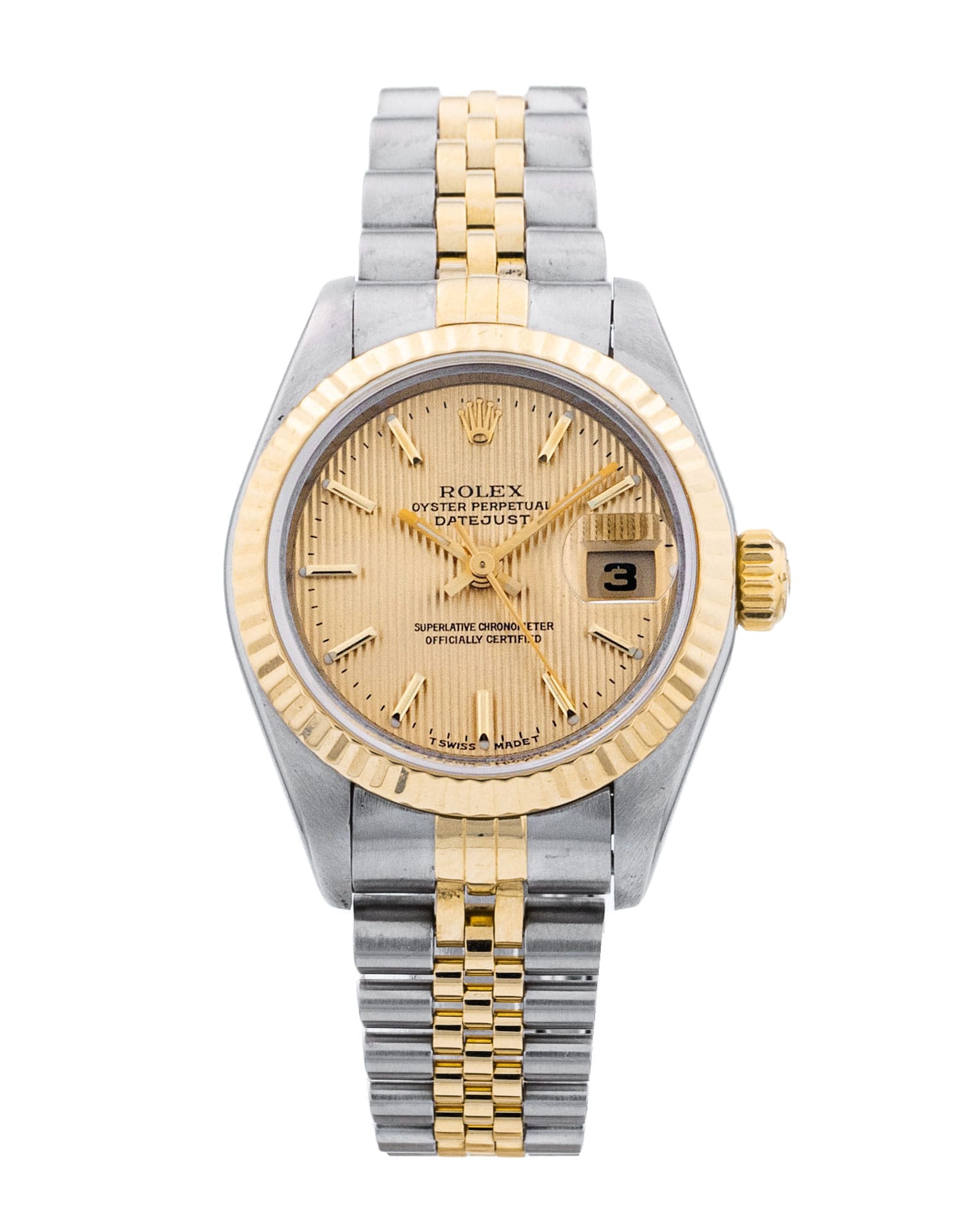 This Rolex Datejust Lady 69173 has a champagne tapestry baton dial and a bracelet strap. This Rolex has undergone a thorough inspection of water resistance, accuracy, functionality and condition to determine the level of reconditioning required to meet our strict standards. It has also been referenced against technical documents and manufacturer records where available to ensure authenticity and a clean history. All our watches have a 24-month warranty for your peace of mind. One of our skilled polishing technicians has removed marks on the case and bracelet of this watch, brought about by daily wear and tear, which is why this watch does not come with the remaining manufacturer’s warranty.