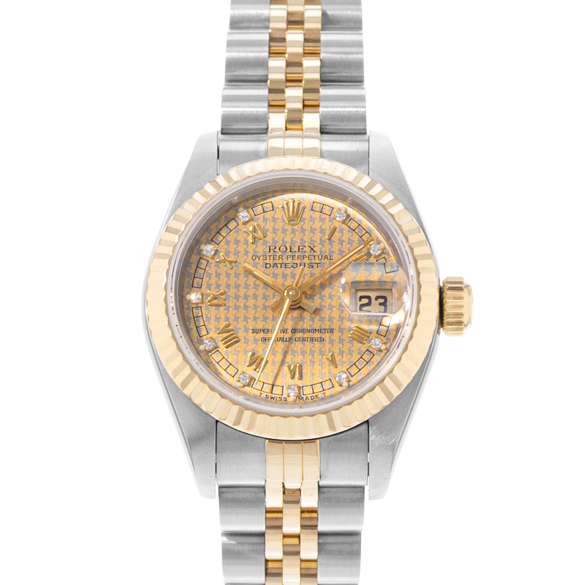 This Rolex Datejust Lady 69173 has a champagne dial and a bracelet strap. This Rolex has undergone a thorough inspection of water resistance, accuracy, functionality and condition to determine the level of reconditioning required to meet our strict standards. It has also been referenced against technical documents and manufacturer records where available to ensure authenticity and a clean history. All our watches have a 24-month warranty for your peace of mind. One of our skilled polishing technicians has removed marks on the case and bracelet of this watch, brought about by daily wear and tear, which is why this watch does not come with the remaining manufacturer’s warranty.