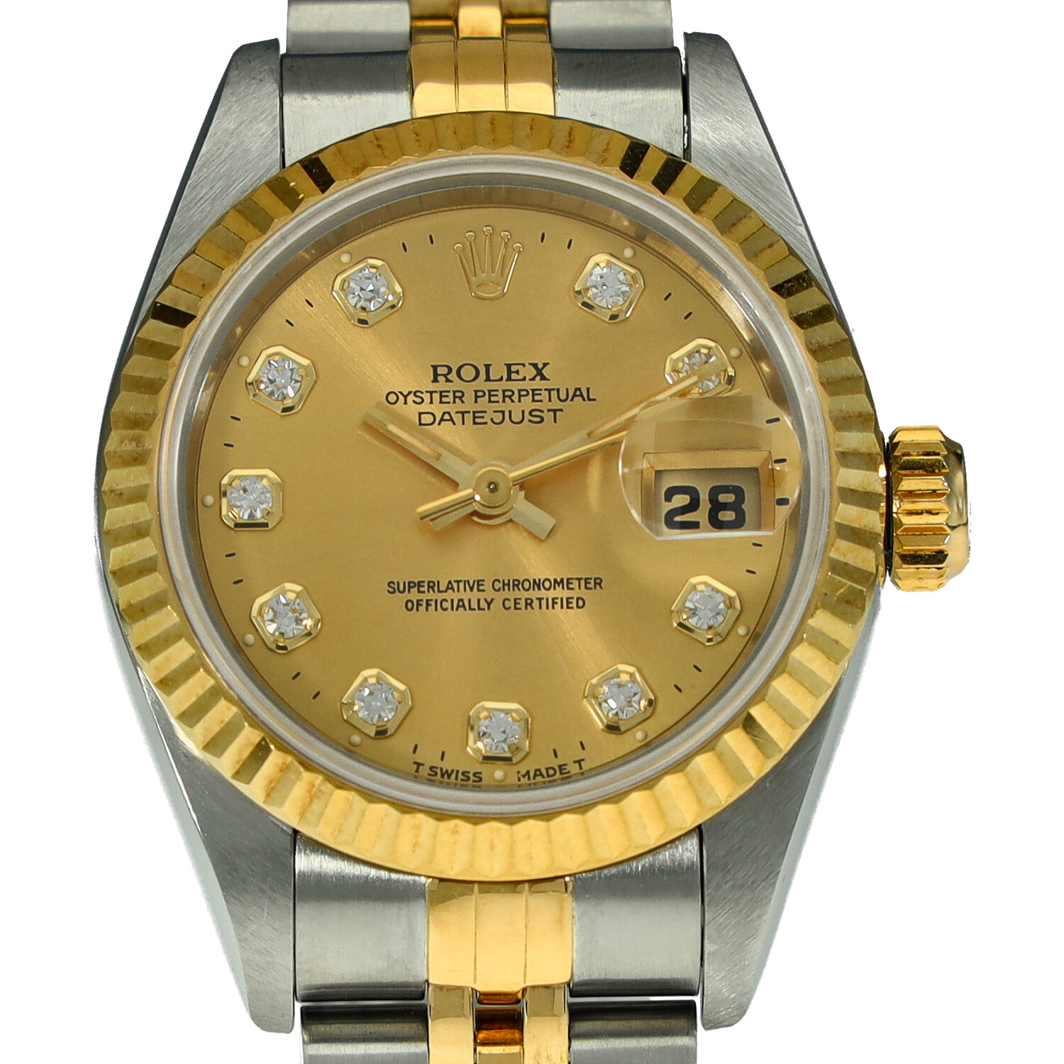 This Rolex Datejust Lady 69173 has a champagne diamond dial and a bracelet strap. This Rolex has undergone a thorough inspection of water resistance, accuracy, functionality and condition to determine the level of reconditioning required to meet our strict standards. It has also been referenced against technical documents and manufacturer records where available to ensure authenticity and a clean history. All our watches have a 24-month warranty for your peace of mind. One of our skilled polishing technicians has removed marks on the case and bracelet of this watch, brought about by daily wear and tear, which is why this watch does not come with the remaining manufacturer’s warranty.