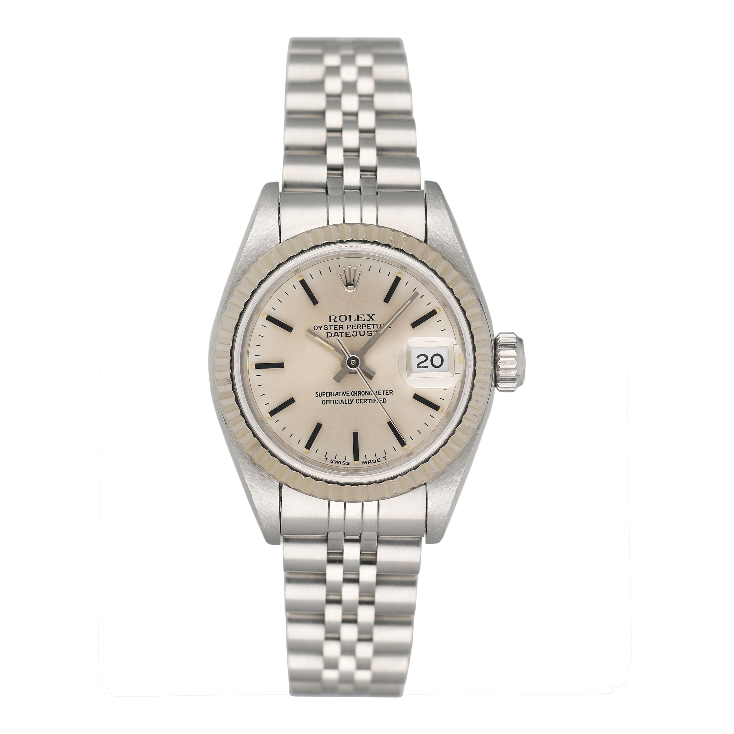 This Rolex Datejust Lady 69174 has a silver baton dial and a bracelet strap. This Rolex has undergone a thorough inspection of water resistance, accuracy, functionality and condition to determine the level of reconditioning required to meet our strict standards. It has also been referenced against technical documents and manufacturer records where available to ensure authenticity and a clean history. All our watches have a 24-month warranty for your peace of mind. One of our skilled polishing technicians has removed marks on the case and bracelet of this watch, brought about by daily wear and tear, which is why this watch does not come with the remaining manufacturer’s warranty.
