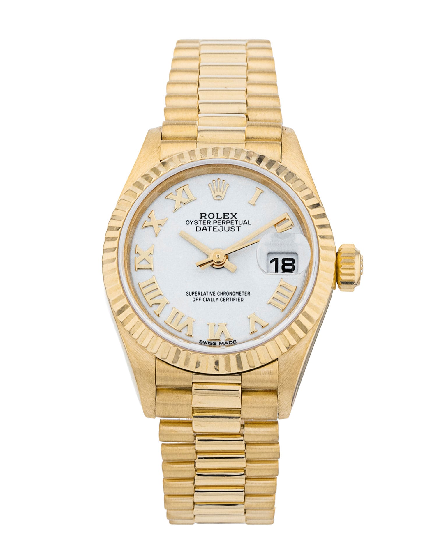 This Rolex Datejust Lady 69178 has a white roman numeral dial and a bracelet strap. This Rolex has undergone a thorough inspection of water resistance, accuracy, functionality and condition to determine the level of reconditioning required to meet our strict standards. It has also been referenced against technical documents and manufacturer records where available to ensure authenticity and a clean history. All our watches have a 24-month warranty for your peace of mind. One of our skilled polishing technicians has removed marks on the case and bracelet of this watch, brought about by daily wear and tear, which is why this watch does not come with the remaining manufacturer’s warranty.