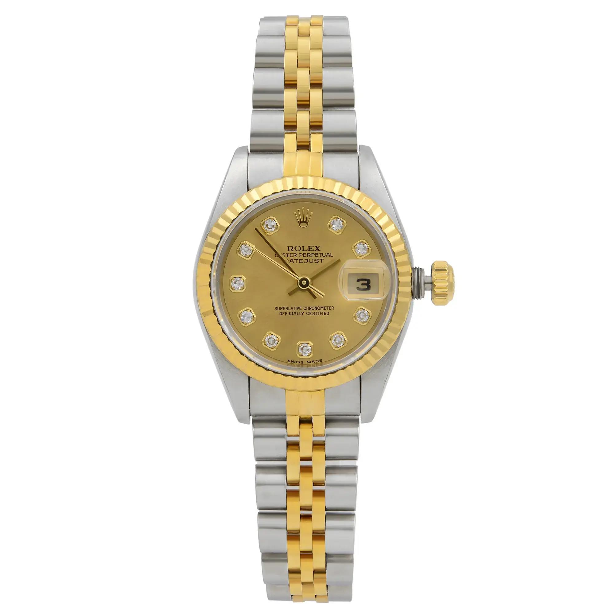 This Rolex Datejust Lady 79173 has a champagne diamond dial and a bracelet strap. This Rolex has undergone a thorough inspection of water resistance, accuracy, functionality and condition to determine the level of reconditioning required to meet our strict standards. It has also been referenced against technical documents and manufacturer records where available to ensure authenticity and a clean history. All our watches have a 24-month warranty for your peace of mind. One of our skilled polishing technicians has removed marks on the case and bracelet of this watch, brought about by daily wear and tear, which is why this watch does not come with the remaining manufacturer’s warranty.