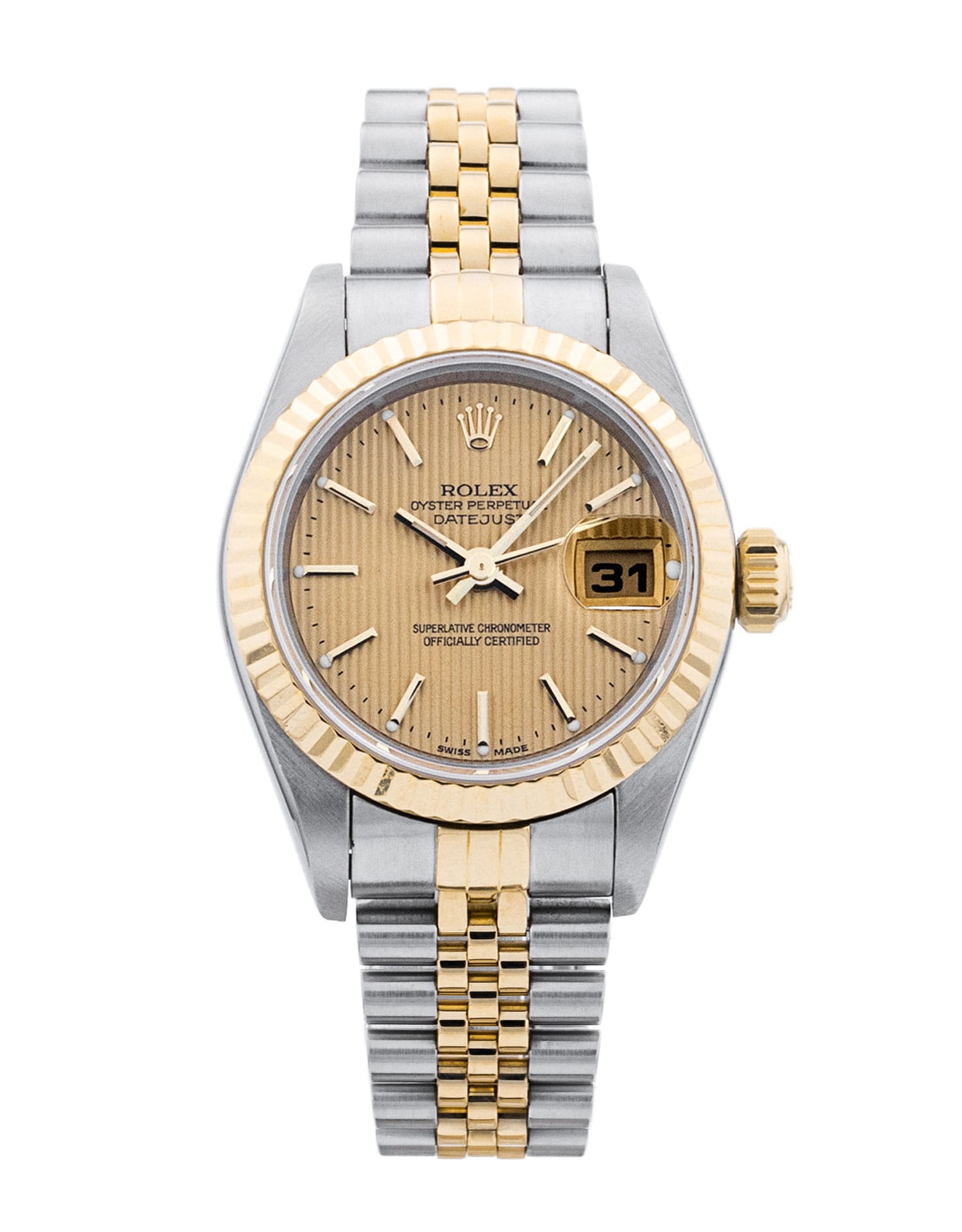This Rolex Datejust Lady 79173 has a champagne tapestry baton dial and a bracelet strap. This Rolex has undergone a thorough inspection of water resistance, accuracy, functionality and condition to determine the level of reconditioning required to meet our strict standards. It has also been referenced against technical documents and manufacturer records where available to ensure authenticity and a clean history. Our watches have a 24-month warranty for your peace of mind, in conjunction with any remaining manufacturer’s warranty from new or from service. To maintain the manufacturer’s warranty on this watch, it has not been polished in our service centre.