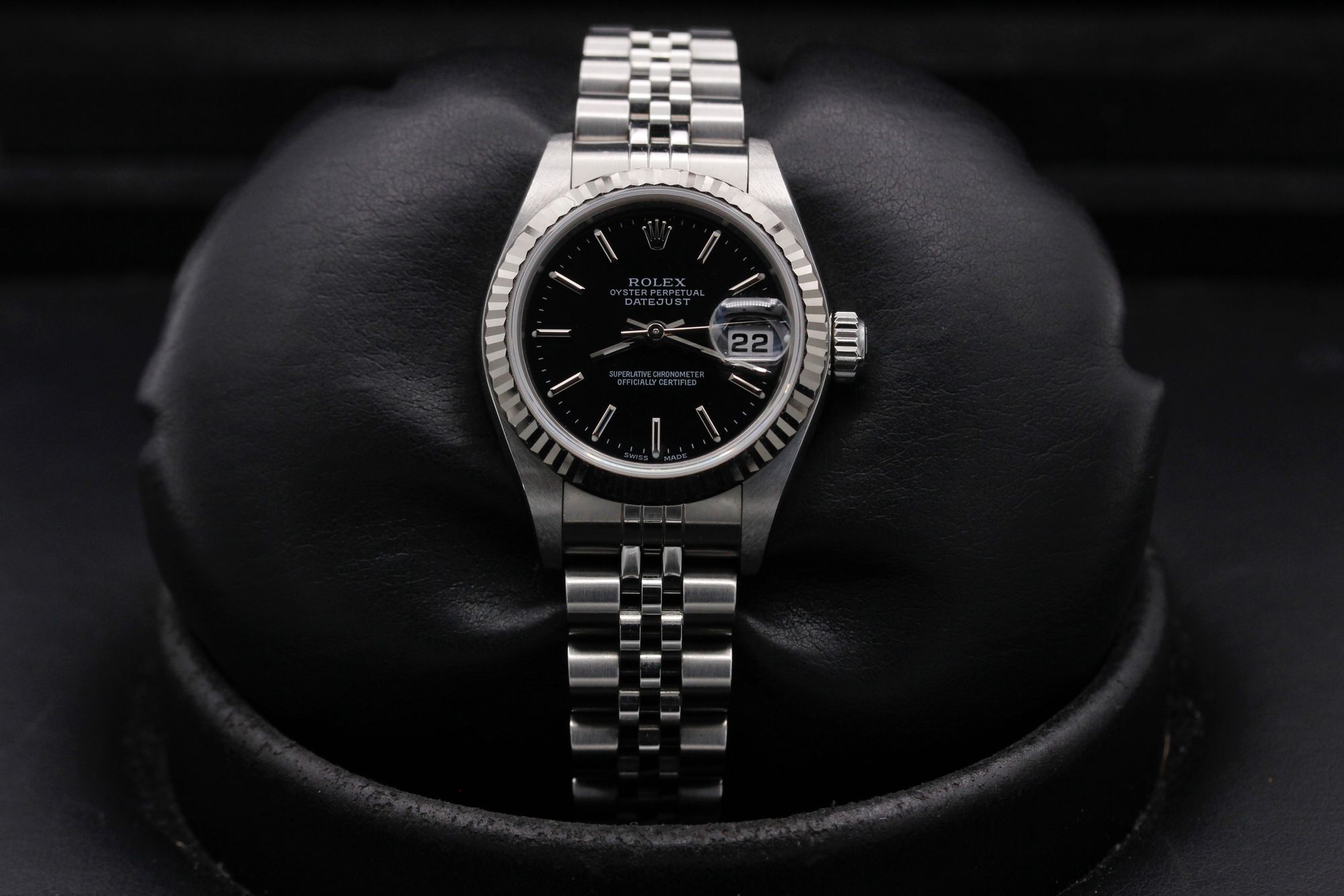 This Rolex Datejust Lady 79174 has a black baton dial and a bracelet strap. This Rolex has undergone a thorough inspection of water resistance, accuracy, functionality and condition to determine the level of reconditioning required to meet our strict standards. It has also been referenced against technical documents and manufacturer records where available to ensure authenticity and a clean history. All our watches have a 24-month warranty for your peace of mind. One of our skilled polishing technicians has removed marks on the case and bracelet of this watch, brought about by daily wear and tear, which is why this watch does not come with the remaining manufacturer’s warranty.