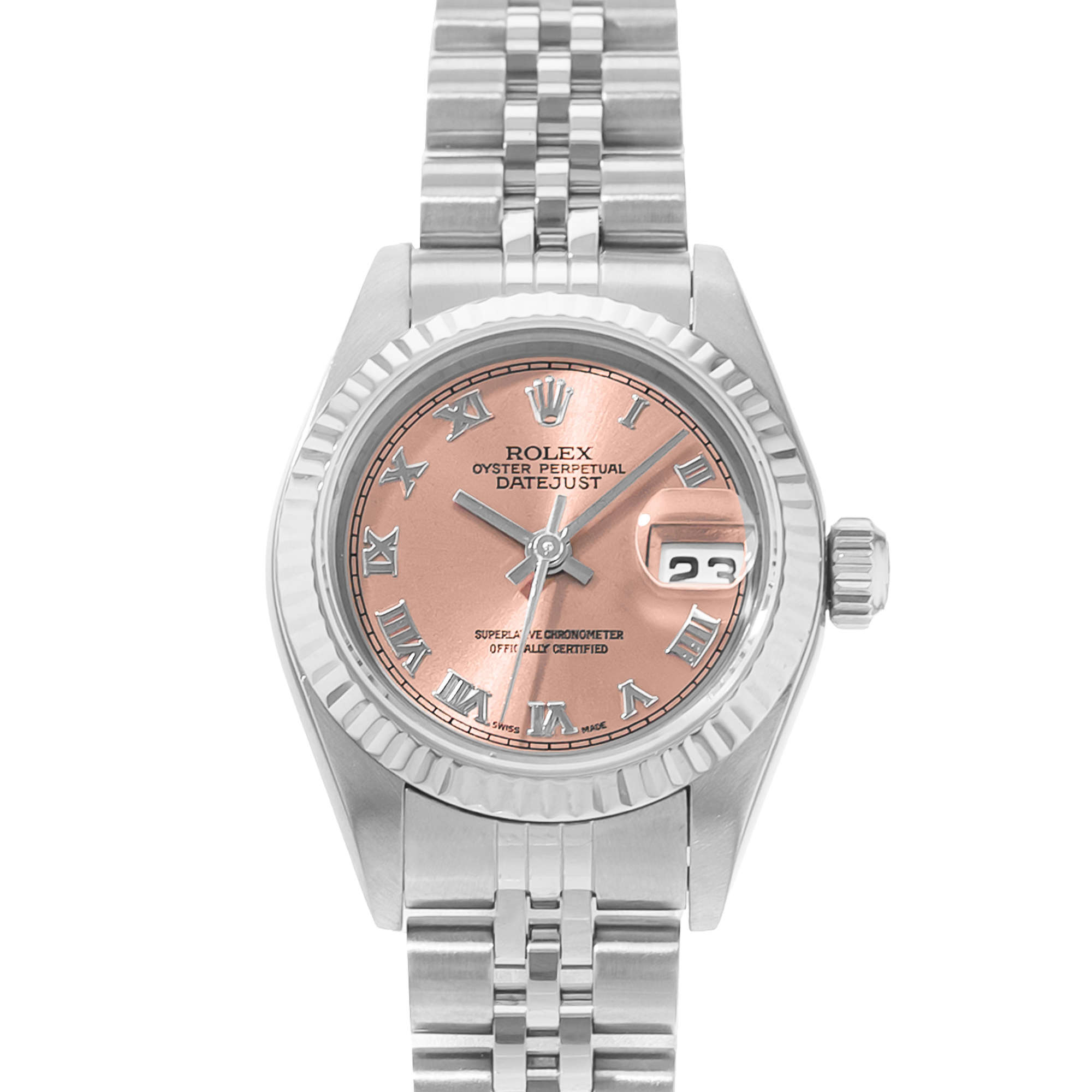 This Rolex Datejust Lady 79174 has a salmon roman numeral dial and a bracelet strap. This Rolex has undergone a thorough inspection of water resistance, accuracy, functionality and condition to determine the level of reconditioning required to meet our strict standards. It has also been referenced against technical documents and manufacturer records where available to ensure authenticity and a clean history. All our watches have a 24-month warranty for your peace of mind. One of our skilled polishing technicians has removed marks on the case and bracelet of this watch, brought about by daily wear and tear, which is why this watch does not come with the remaining manufacturer’s warranty.
