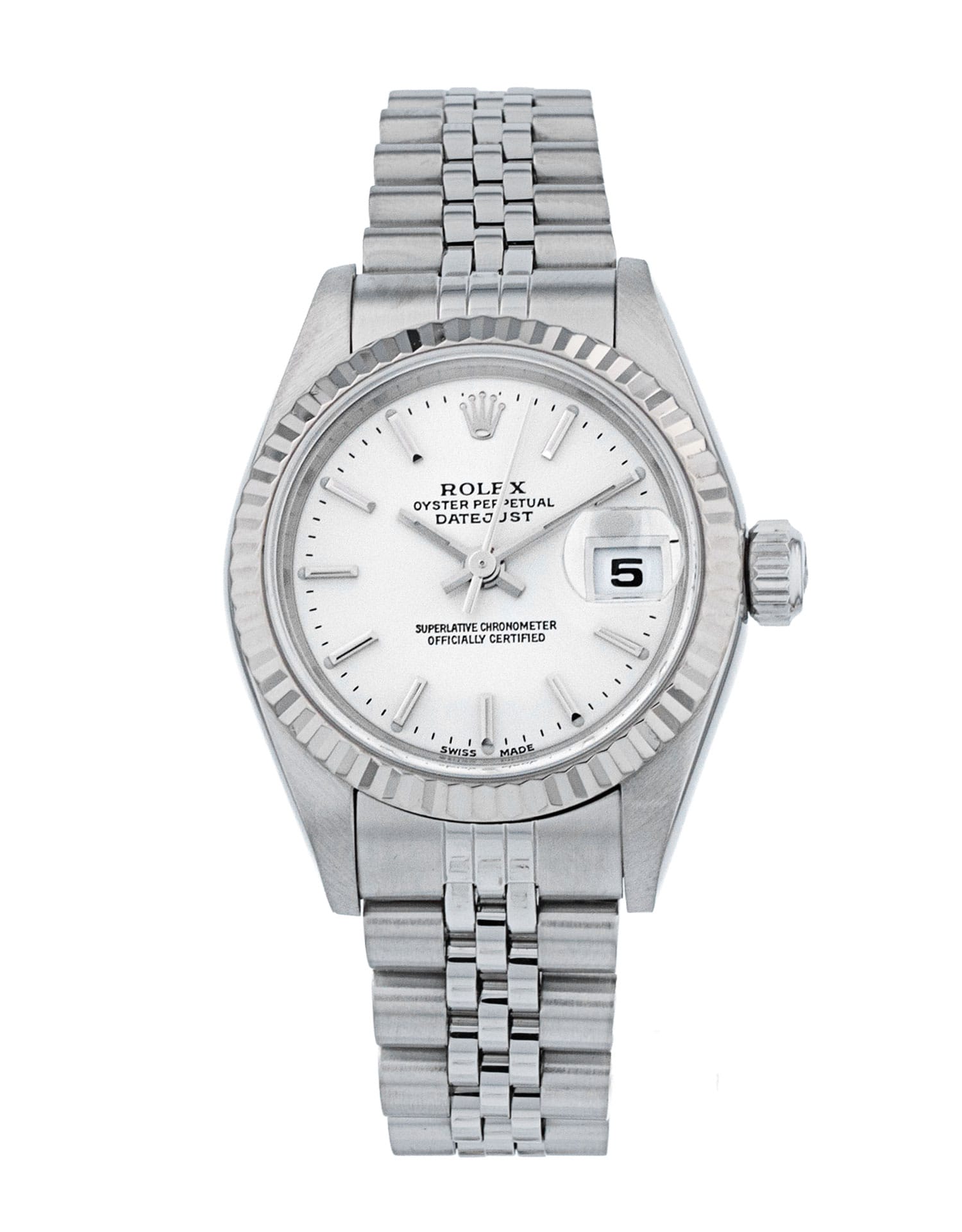 This Rolex Datejust Lady 79174 has a silver baton dial and a bracelet strap. This Rolex has undergone a thorough inspection of water resistance, accuracy, functionality and condition to determine the level of reconditioning required to meet our strict standards. It has also been referenced against technical documents and manufacturer records where available to ensure authenticity and a clean history. All our watches have a 24-month warranty for your peace of mind. One of our skilled polishing technicians has removed marks on the case and bracelet of this watch, brought about by daily wear and tear, which is why this watch does not come with the remaining manufacturer’s warranty.