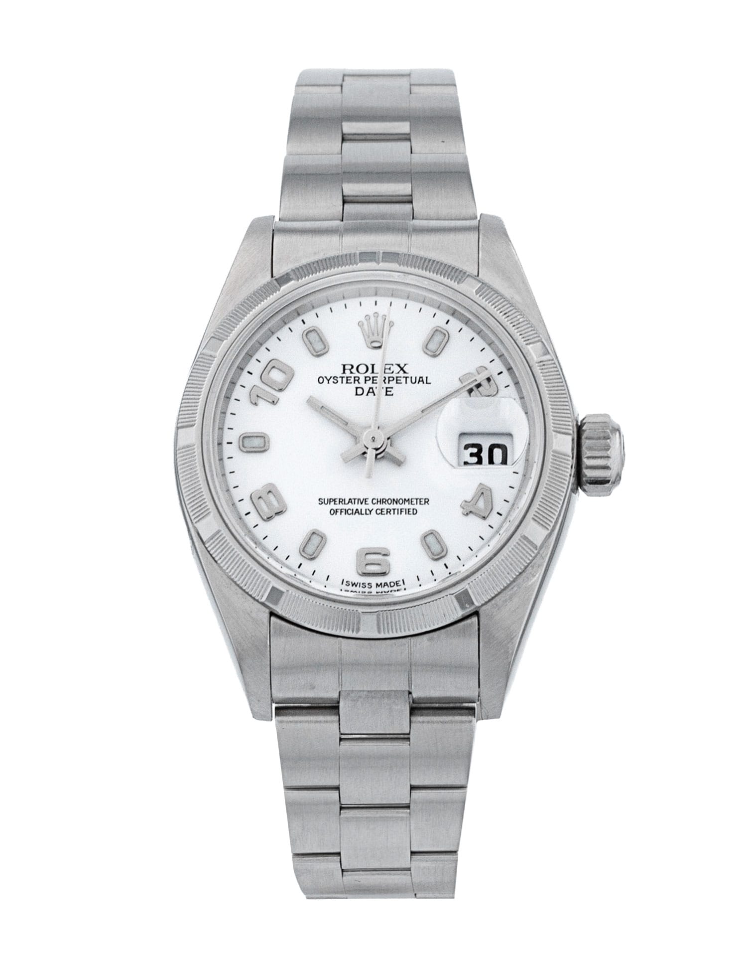 This Rolex Datejust Lady 79190 has a white arabic dial and a bracelet strap. This Rolex has undergone a thorough inspection of water resistance, accuracy, functionality and condition to determine the level of reconditioning required to meet our strict standards. It has also been referenced against technical documents and manufacturer records where available to ensure authenticity and a clean history. All our watches have a 24-month warranty for your peace of mind. One of our skilled polishing technicians has removed marks on the case and bracelet of this watch, brought about by daily wear and tear, which is why this watch does not come with the remaining manufacturer’s warranty.