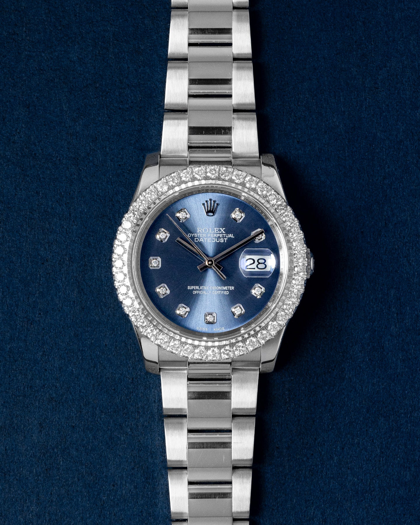 This Rolex Datejust 116200 has a blue baton dial and a bracelet strap. This Rolex has undergone a thorough inspection of water resistance, accuracy, functionality and condition to determine the level of reconditioning required to meet our strict standards. It has also been referenced against technical documents and manufacturer records where available to ensure authenticity and a clean history. All our watches have a 24-month warranty for your peace of mind. One of our skilled polishing technicians has removed marks on the case and bracelet of this watch, brought about by daily wear and tear, which is why this watch does not come with the remaining manufacturer’s warranty.