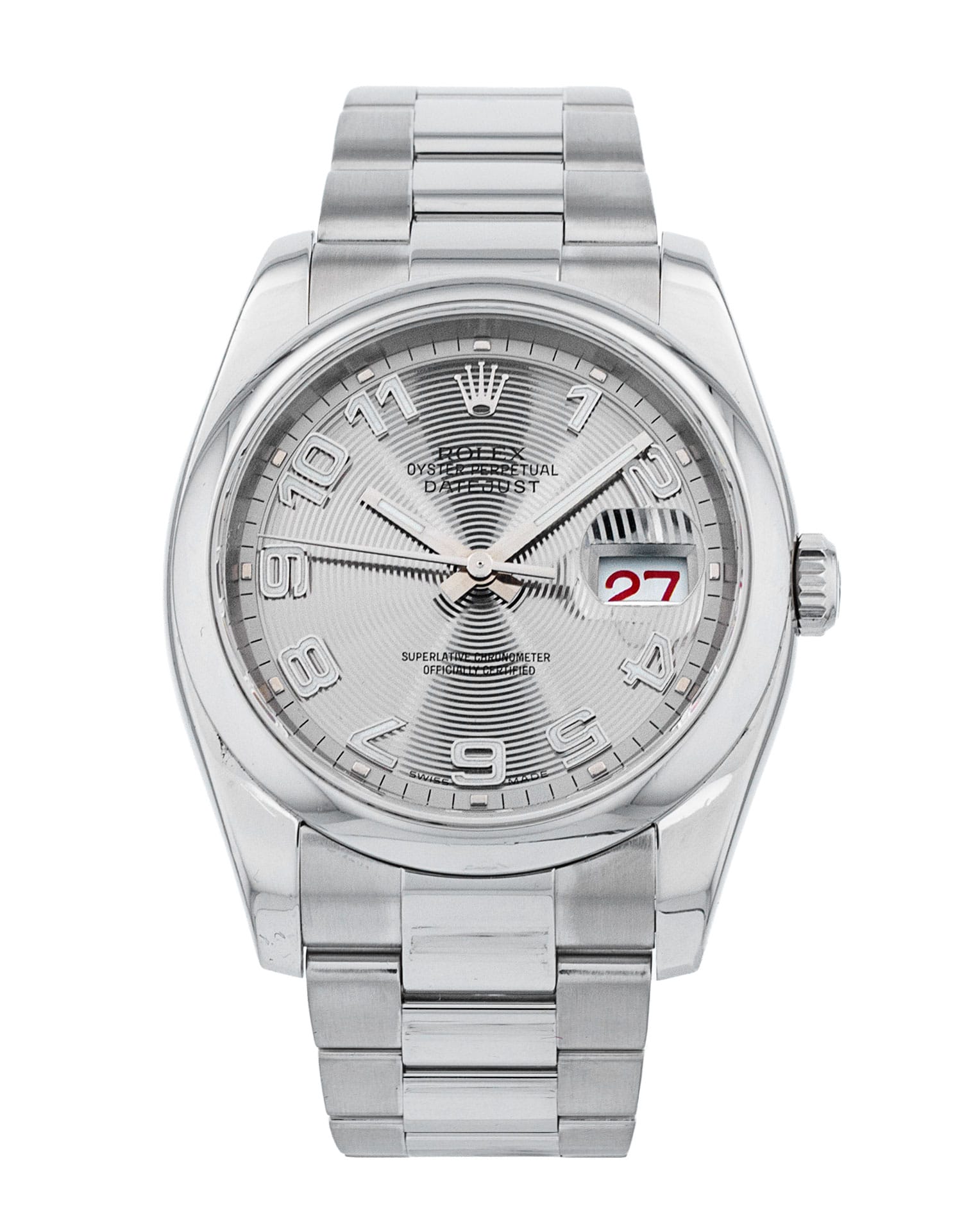 This Rolex Datejust 116200 has a silver concentric arabic dial and a bracelet strap. This Rolex has undergone a thorough inspection of water resistance, accuracy, functionality and condition to determine the level of reconditioning required to meet our strict standards. It has also been referenced against technical documents and manufacturer records where available to ensure authenticity and a clean history. All our watches have a 24-month warranty for your peace of mind. One of our skilled polishing technicians has removed marks on the case and bracelet of this watch, brought about by daily wear and tear, which is why this watch does not come with the remaining manufacturer’s warranty.