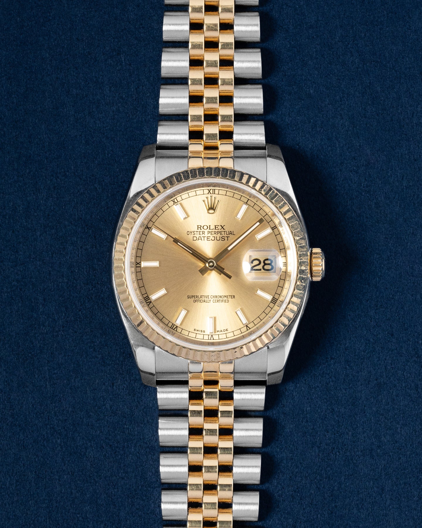 This Rolex Datejust 116233 has a champagne baton dial and a bracelet strap. This Rolex has undergone a thorough inspection of water resistance, accuracy, functionality and condition to determine the level of reconditioning required to meet our strict standards. It has also been referenced against technical documents and manufacturer records where available to ensure authenticity and a clean history. All our watches have a 24-month warranty for your peace of mind. One of our skilled polishing technicians has removed marks on the case and bracelet of this watch, brought about by daily wear and tear, which is why this watch does not come with the remaining manufacturer’s warranty.