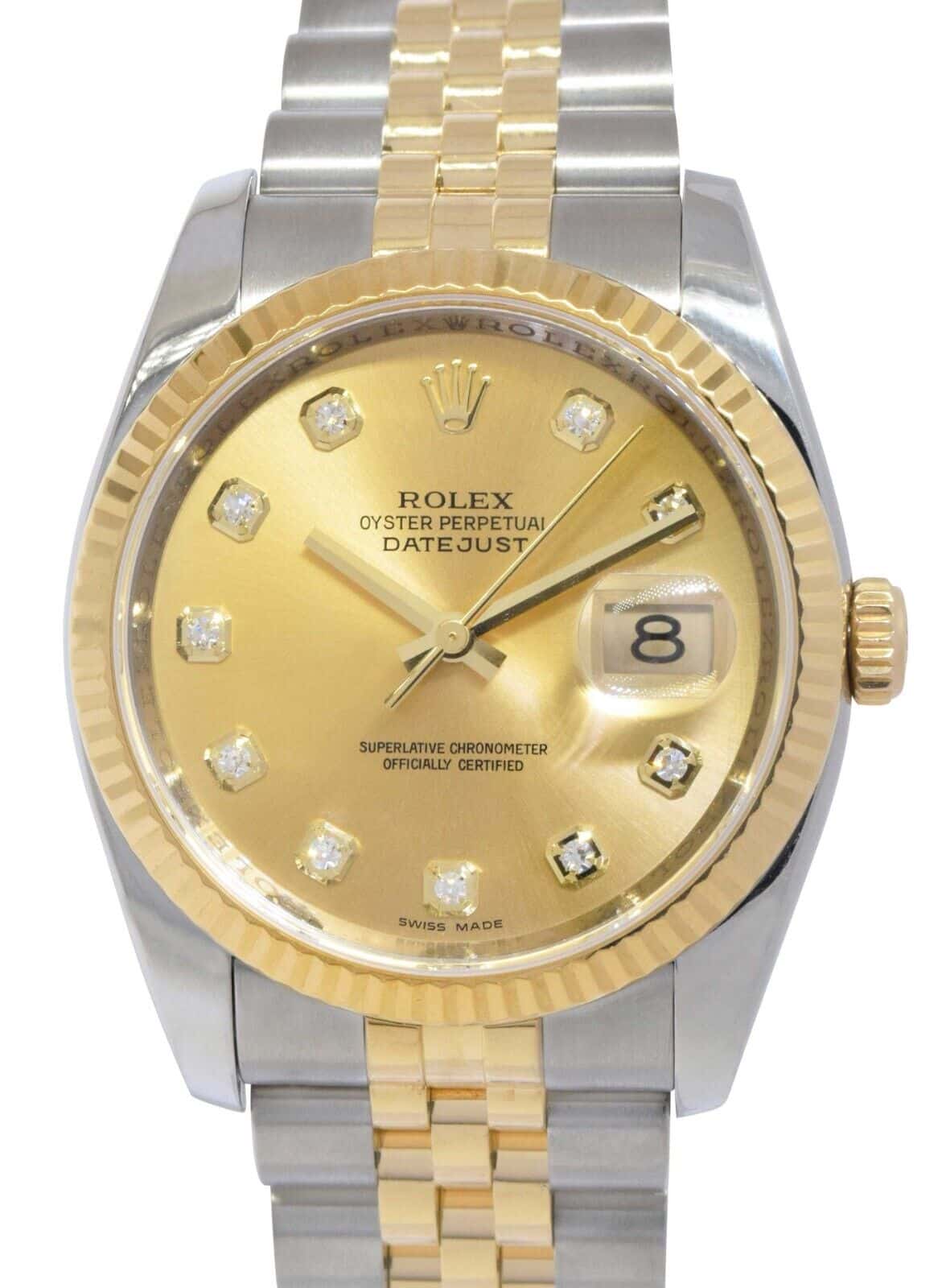 This Rolex Datejust 116233 has a champagne diamond dial and a bracelet strap. This Rolex has undergone a thorough inspection of water resistance, accuracy, functionality and condition to determine the level of reconditioning required to meet our strict standards. It has also been referenced against technical documents and manufacturer records where available to ensure authenticity and a clean history. All our watches have a 24-month warranty for your peace of mind. One of our skilled polishing technicians has removed marks on the case and bracelet of this watch, brought about by daily wear and tear, which is why this watch does not come with the remaining manufacturer’s warranty.