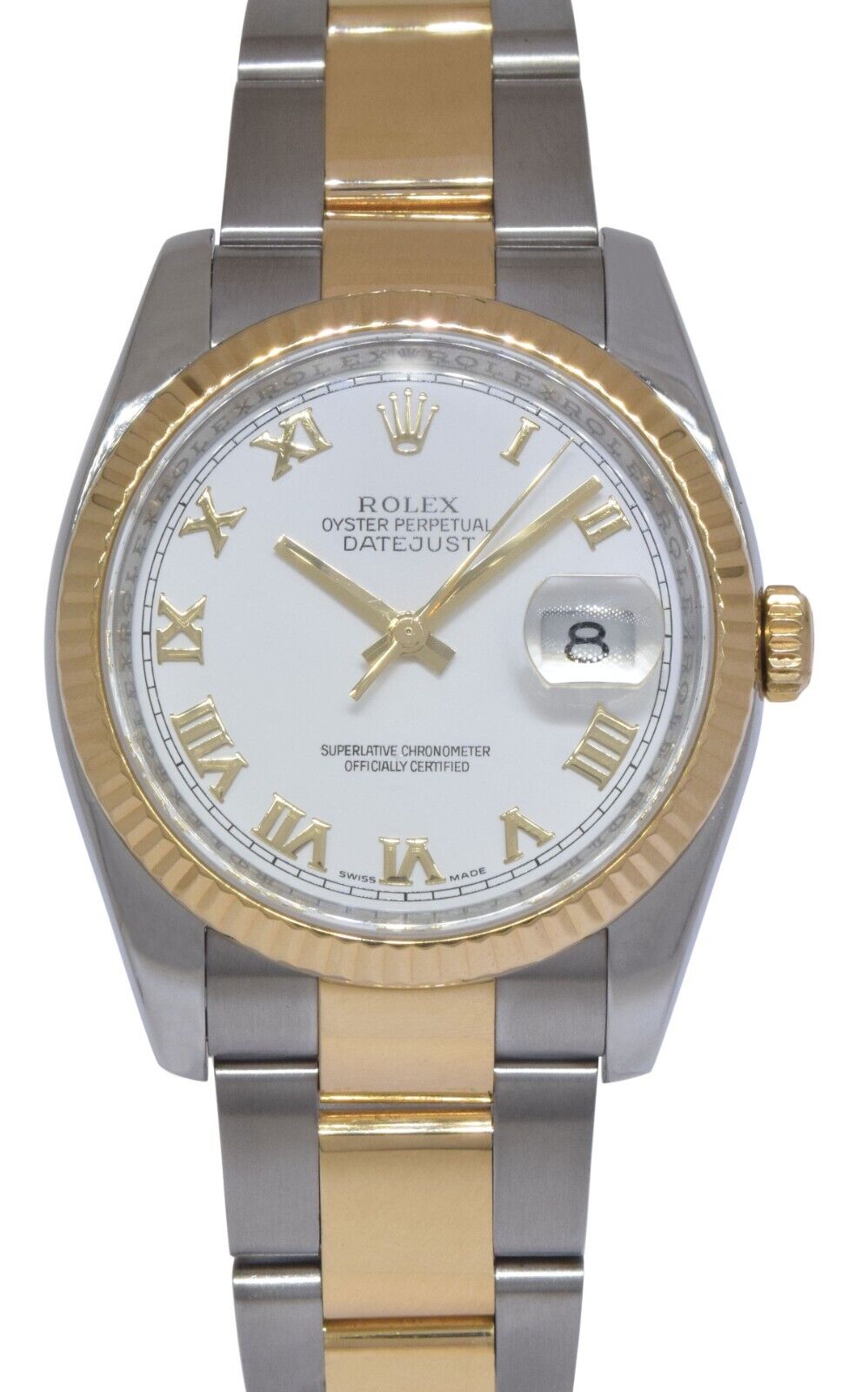 This Rolex Datejust 116233 has a white roman numeral dial and a bracelet strap. This Rolex has undergone a thorough inspection of water resistance, accuracy, functionality and condition to determine the level of reconditioning required to meet our strict standards. It has also been referenced against technical documents and manufacturer records where available to ensure authenticity and a clean history. All our watches have a 24-month warranty for your peace of mind. One of our skilled polishing technicians has removed marks on the case and bracelet of this watch, brought about by daily wear and tear, which is why this watch does not come with the remaining manufacturer’s warranty.