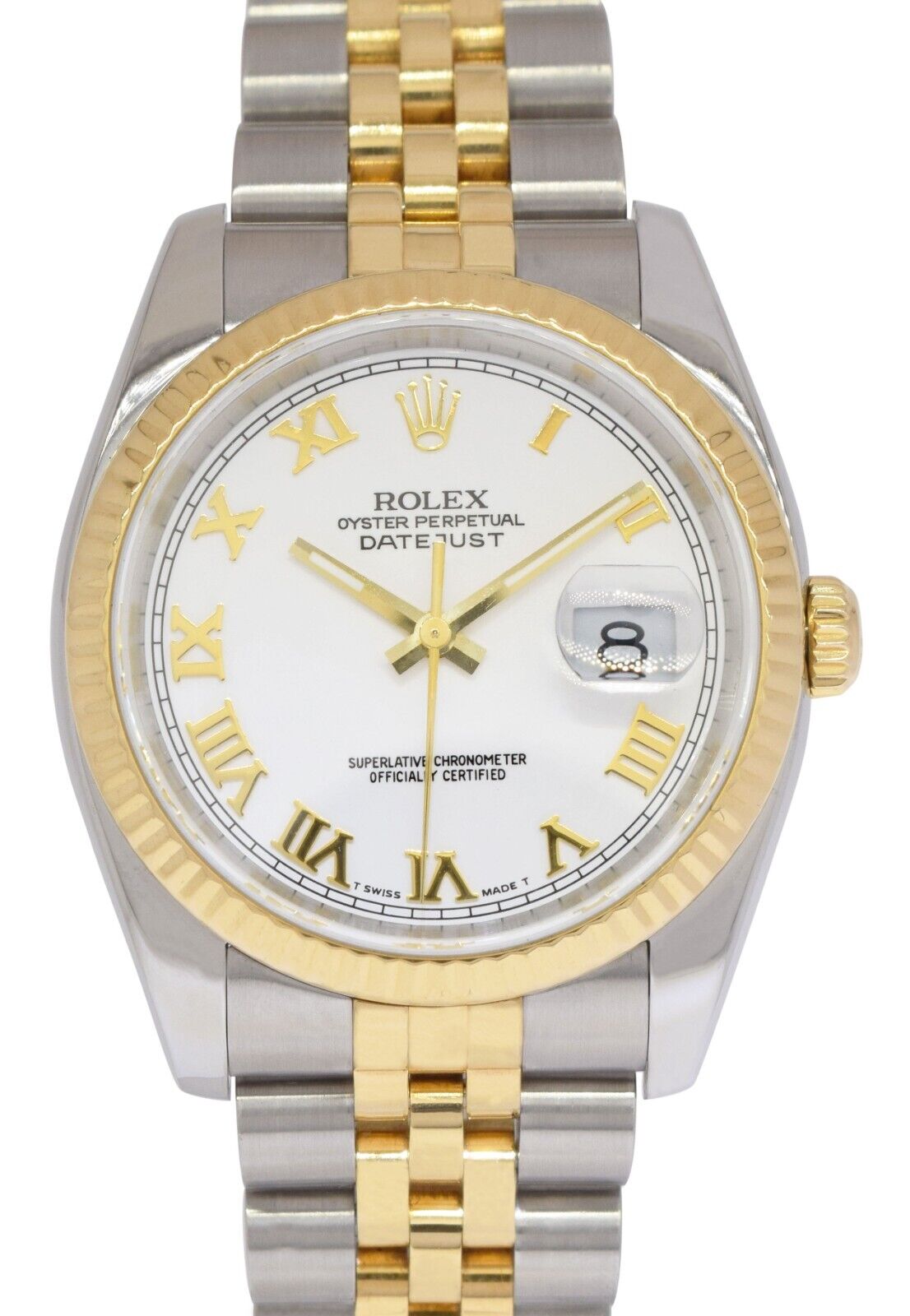 This Rolex Datejust 116233 has a white roman numeral dial and a bracelet strap. This Rolex has undergone a thorough inspection of water resistance, accuracy, functionality and condition to determine the level of reconditioning required to meet our strict standards. It has also been referenced against technical documents and manufacturer records where available to ensure authenticity and a clean history. All our watches have a 24-month warranty for your peace of mind. One of our skilled polishing technicians has removed marks on the case and bracelet of this watch, brought about by daily wear and tear, which is why this watch does not come with the remaining manufacturer’s warranty.