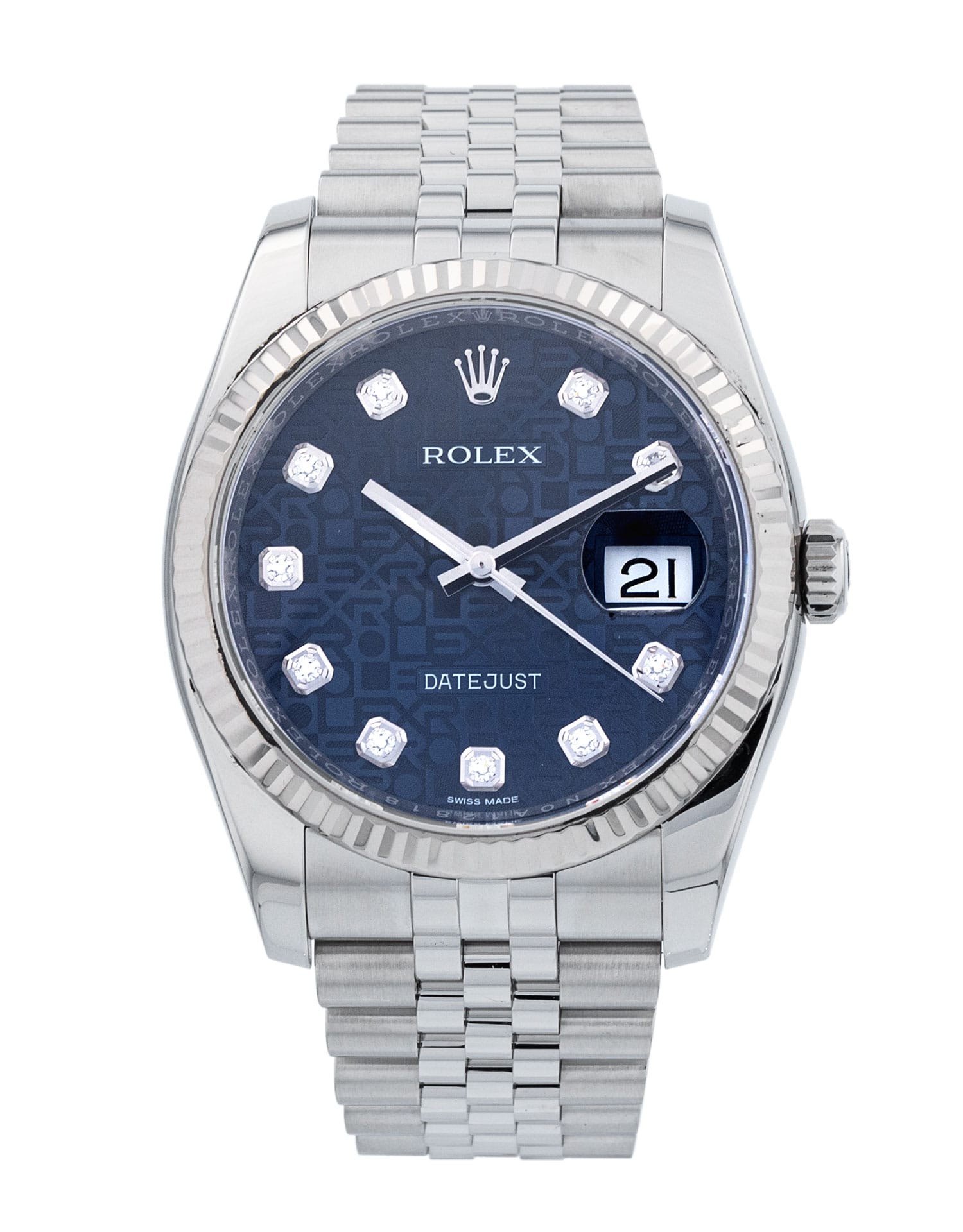 This Rolex Datejust 116234 has a blue jubilee diamond dial and a bracelet strap. This Rolex has undergone a thorough inspection of water resistance, accuracy, functionality and condition to determine the level of reconditioning required to meet our strict standards. It has also been referenced against technical documents and manufacturer records where available to ensure authenticity and a clean history. All our watches have a 24-month warranty for your peace of mind. One of our skilled polishing technicians has removed marks on the case and bracelet of this watch, brought about by daily wear and tear, which is why this watch does not come with the remaining manufacturer’s warranty.