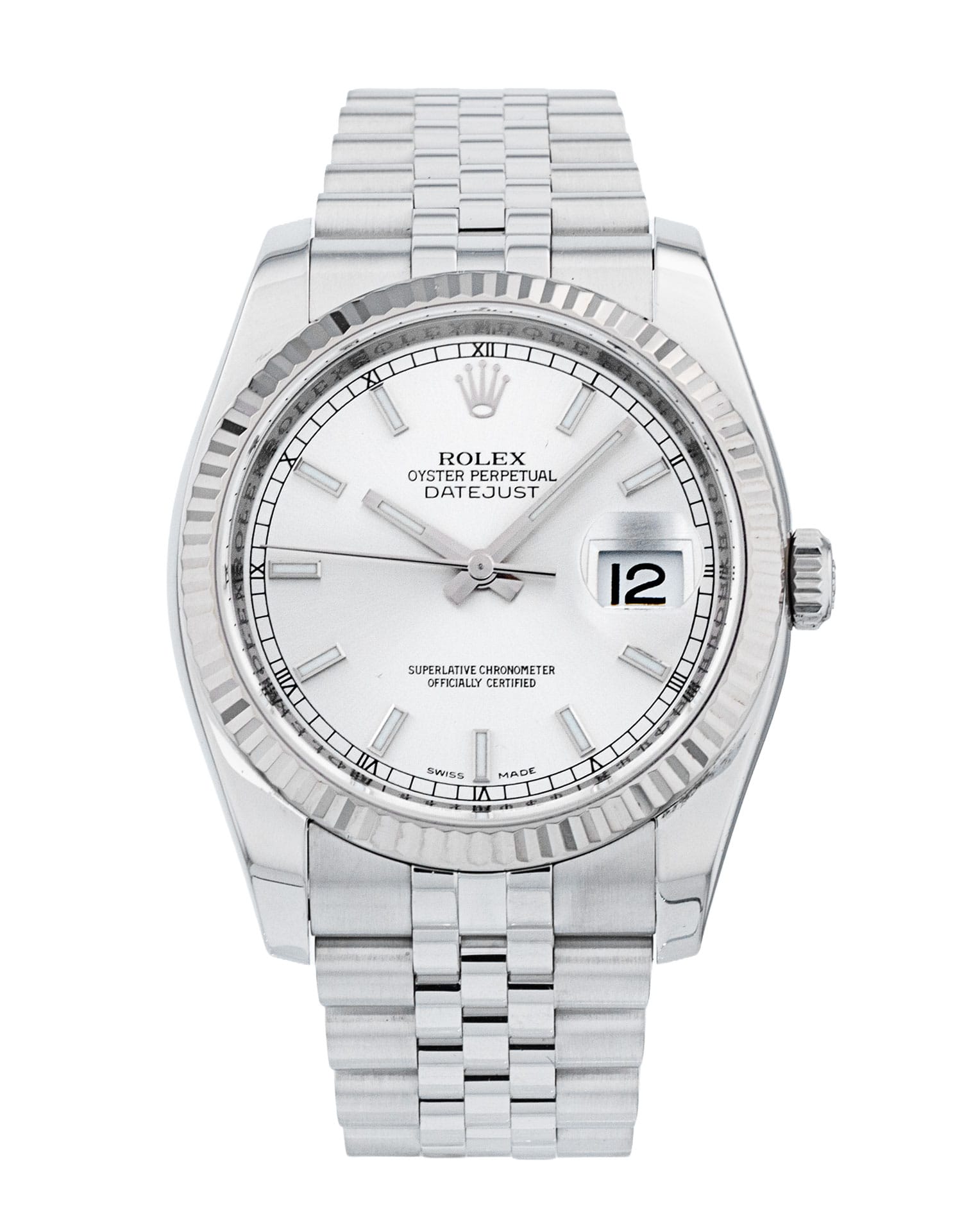 This Rolex Datejust 116234 has a silver baton dial and a bracelet strap. This Rolex has undergone a thorough inspection of water resistance, accuracy, functionality and condition to determine the level of reconditioning required to meet our strict standards. It has also been referenced against technical documents and manufacturer records where available to ensure authenticity and a clean history. All our watches have a 24-month warranty for your peace of mind. One of our skilled polishing technicians has removed marks on the case and bracelet of this watch, brought about by daily wear and tear, which is why this watch does not come with the remaining manufacturer’s warranty.