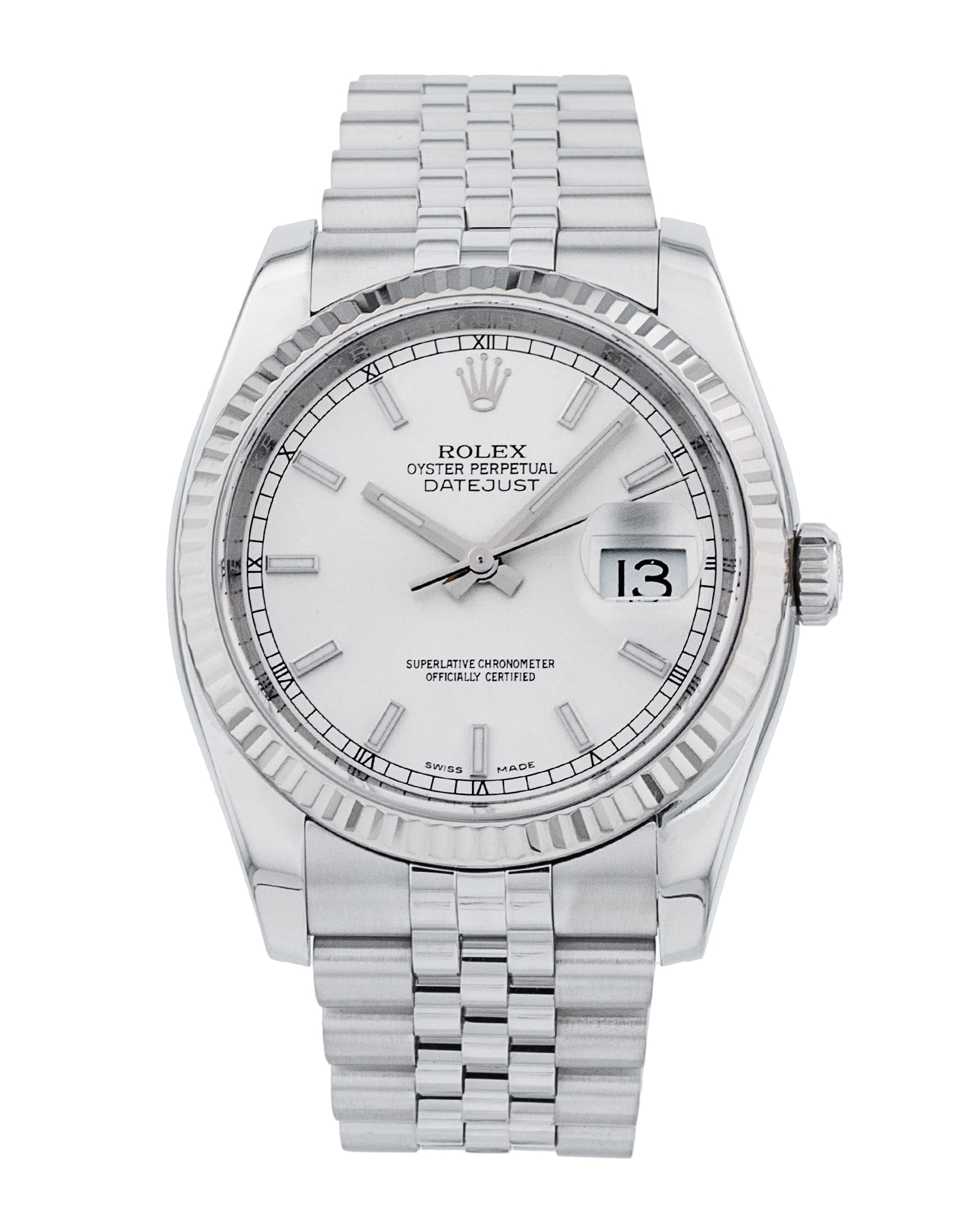 This Rolex Datejust 116234 has a silver baton dial and a bracelet strap. This Rolex has undergone a thorough inspection of water resistance, accuracy, functionality and condition to determine the level of reconditioning required to meet our strict standards. It has also been referenced against technical documents and manufacturer records where available to ensure authenticity and a clean history. All our watches have a 24-month warranty for your peace of mind. One of our skilled polishing technicians has removed marks on the case and bracelet of this watch, brought about by daily wear and tear, which is why this watch does not come with the remaining manufacturer’s warranty.