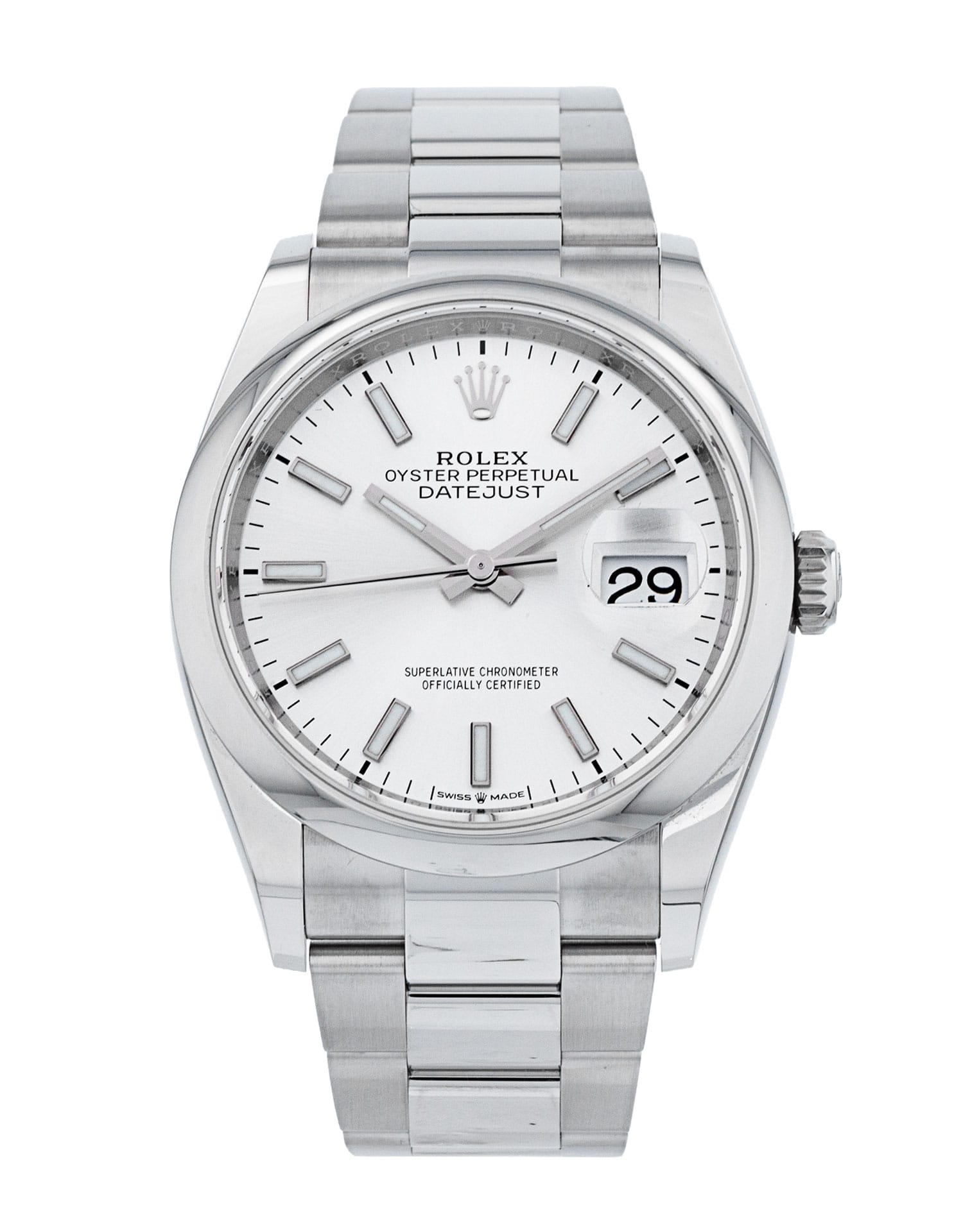 This Rolex Datejust 126200 has a silver baton dial and a bracelet strap. This Rolex has undergone a thorough inspection of water resistance, accuracy, functionality and condition to determine the level of reconditioning required to meet our strict standards. It has also been referenced against technical documents and manufacturer records where available to ensure authenticity and a clean history. Our watches have a 24-month warranty for your peace of mind, in conjunction with any remaining manufacturer’s warranty from new or from service. To maintain the manufacturer’s warranty on this watch, it has not been polished in our service centre.