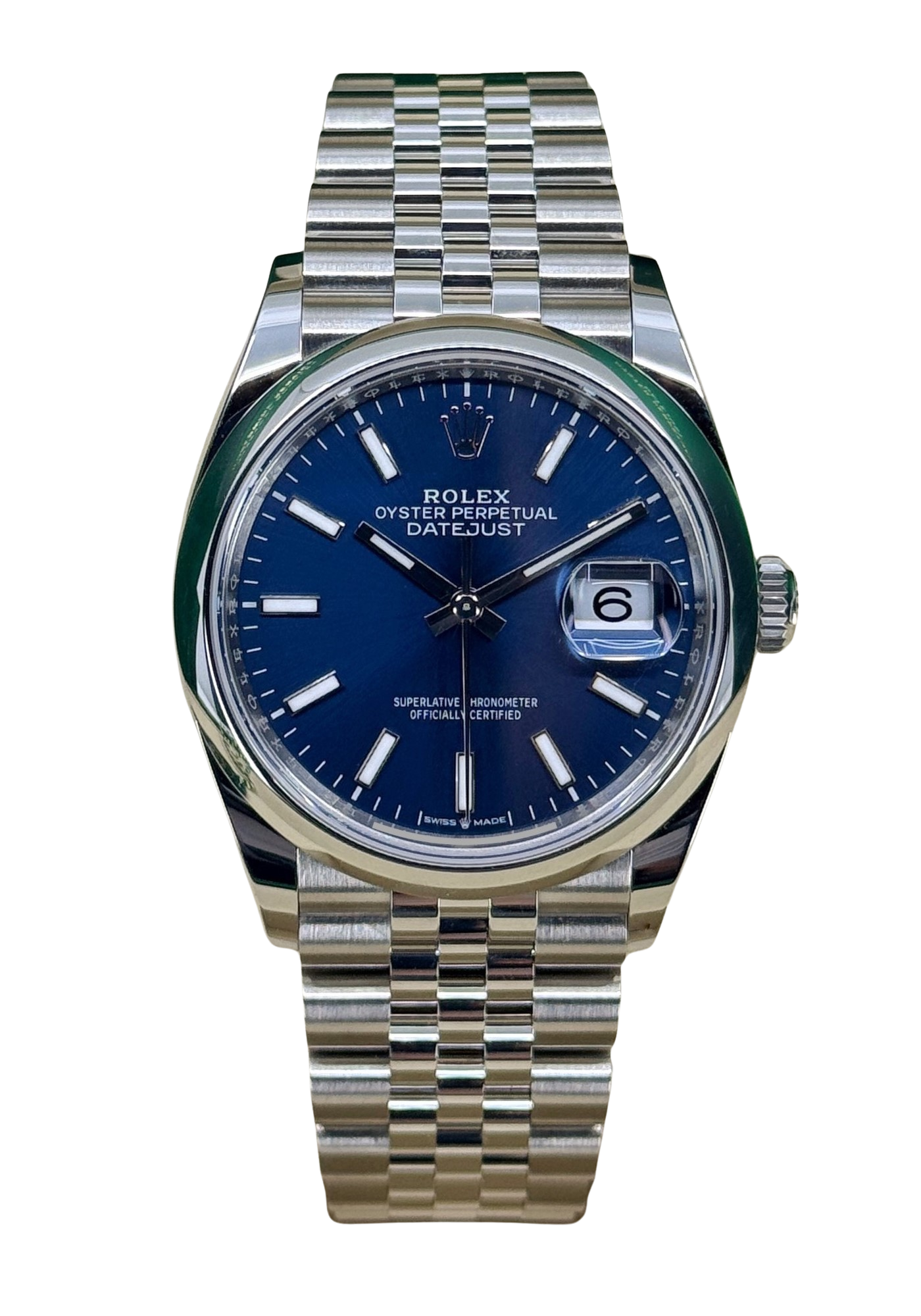This Rolex Datejust 126200 has a blue baton dial and a bracelet strap. This Rolex has undergone a thorough inspection of water resistance, accuracy, functionality and condition to determine the level of reconditioning required to meet our strict standards. It has also been referenced against technical documents and manufacturer records where available to ensure authenticity and a clean history. Our watches have a 24-month warranty for your peace of mind, in conjunction with any remaining manufacturer’s warranty from new or from service. To maintain the manufacturer’s warranty on this watch, it has not been polished in our service centre.