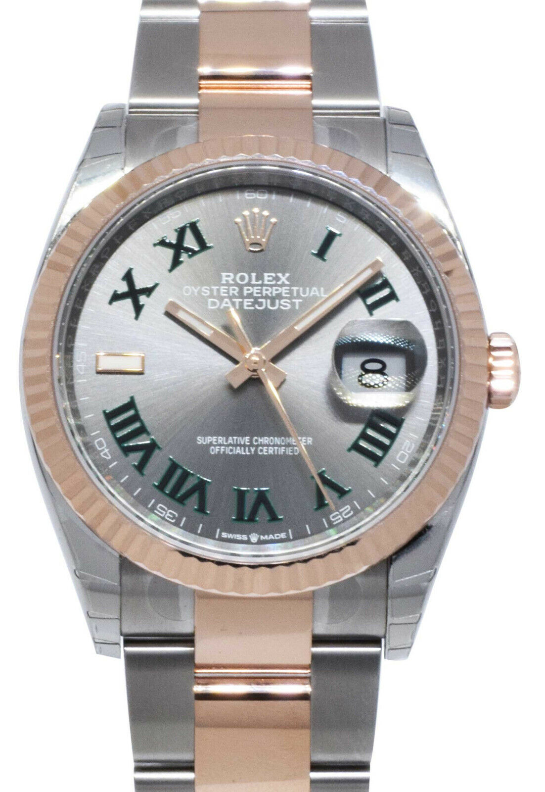 This Rolex Datejust 126231 has a slate roman numeral dial and a bracelet strap. This Rolex has undergone a thorough inspection of water resistance, accuracy, functionality and condition to determine the level of reconditioning required to meet our strict standards. It has also been referenced against technical documents and manufacturer records where available to ensure authenticity and a clean history. Our watches have a 24-month warranty for your peace of mind, in conjunction with any remaining manufacturer’s warranty from new or from service. To maintain the manufacturer’s warranty on this watch, it has not been polished in our service centre.
