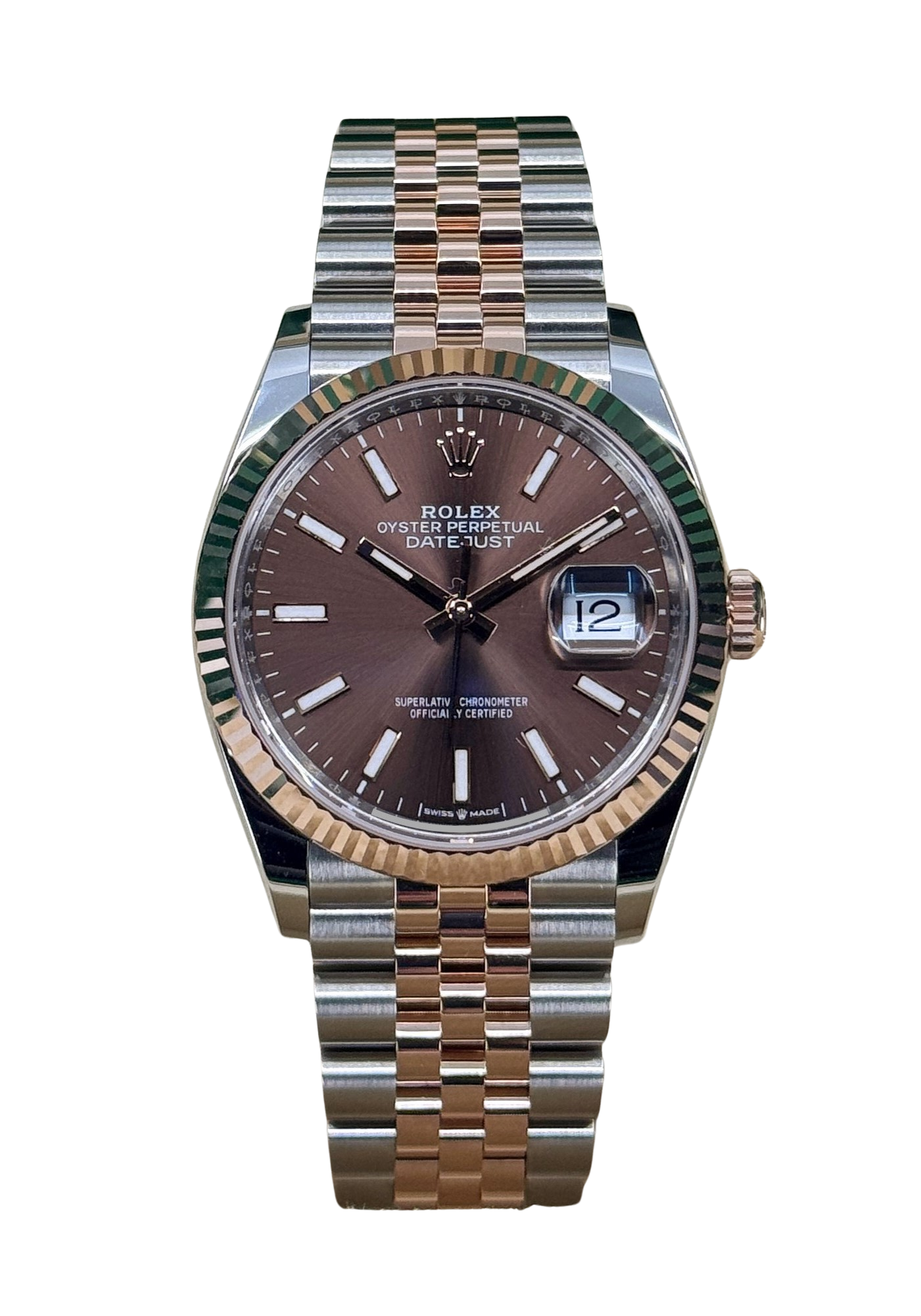 This Rolex Datejust 126231 has a chocolate baton dial and a bracelet strap. This Rolex has undergone a thorough inspection of water resistance, accuracy, functionality and condition to determine the level of reconditioning required to meet our strict standards. It has also been referenced against technical documents and manufacturer records where available to ensure authenticity and a clean history. Our watches have a 24-month warranty for your peace of mind, in conjunction with any remaining manufacturer’s warranty from new or from service. To maintain the manufacturer’s warranty on this watch, it has not been polished in our service centre.