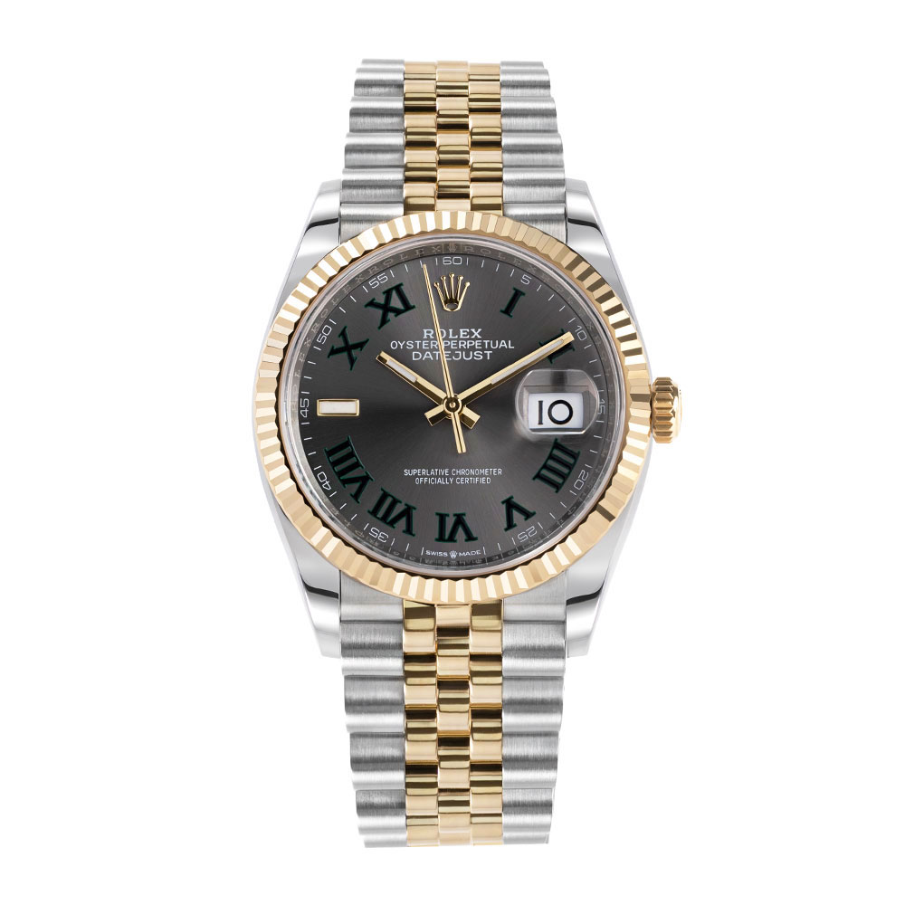 This Rolex Datejust 126233 has a slate roman numeral dial and a bracelet strap. This Rolex has undergone a thorough inspection of water resistance, accuracy, functionality and condition to determine the level of reconditioning required to meet our strict standards. It has also been referenced against technical documents and manufacturer records where available to ensure authenticity and a clean history. All our watches have a 24-month warranty for your peace of mind. One of our skilled polishing technicians has removed marks on the case and bracelet of this watch, brought about by daily wear and tear, which is why this watch does not come with the remaining manufacturer’s warranty.