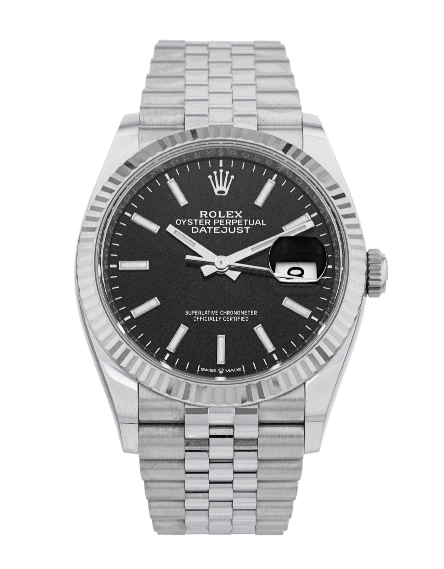This Rolex Datejust 126234 has a black baton dial and a bracelet strap. This Rolex has undergone a thorough inspection of water resistance, accuracy, functionality and condition to determine the level of reconditioning required to meet our strict standards. It has also been referenced against technical documents and manufacturer records where available to ensure authenticity and a clean history. Our watches have a 24-month warranty for your peace of mind, in conjunction with any remaining manufacturer’s warranty from new or from service. To maintain the manufacturer’s warranty on this watch, it has not been polished in our service centre.