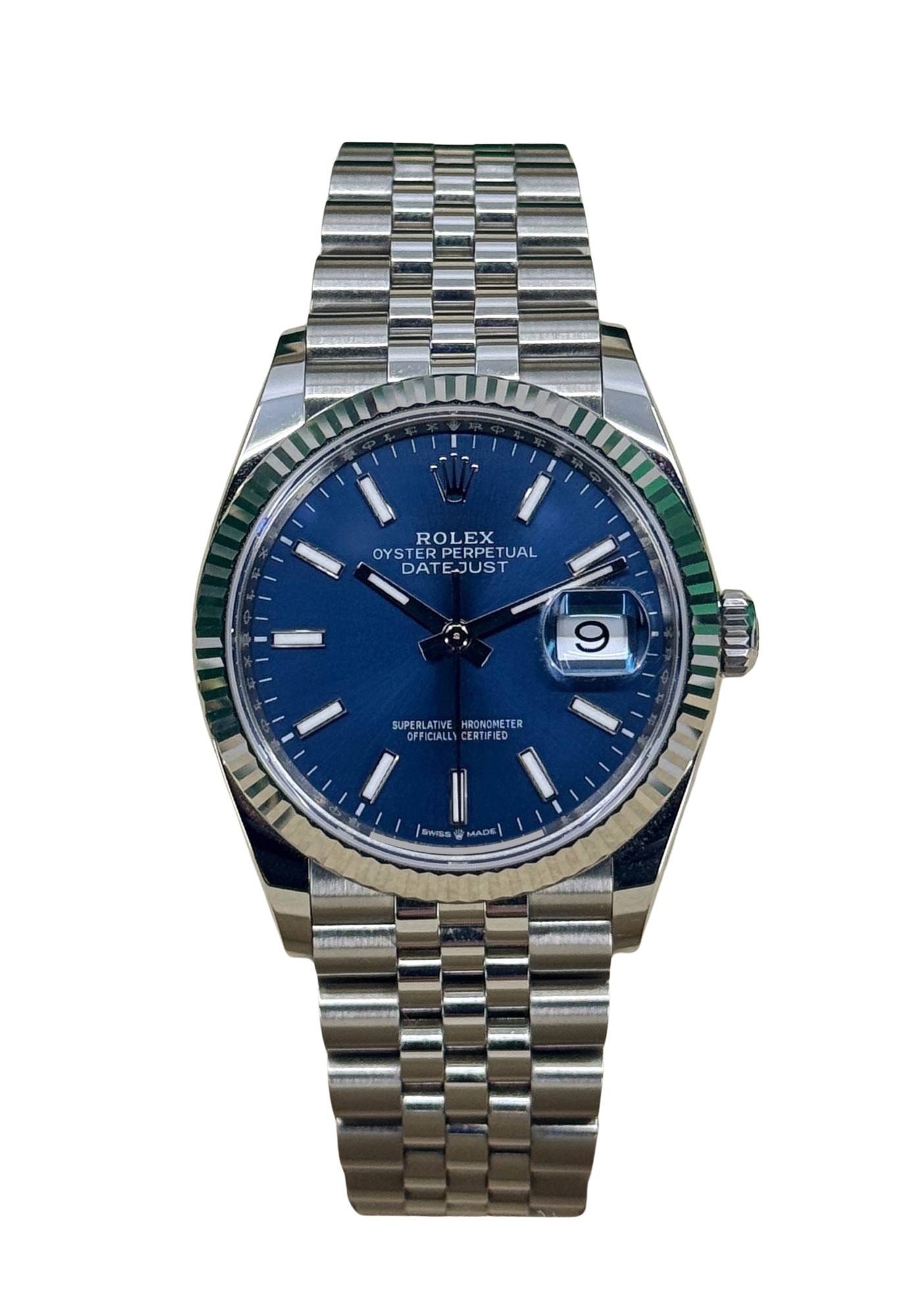 This Rolex Datejust 126234 has a blue baton dial and a bracelet strap. This Rolex has undergone a thorough inspection of water resistance, accuracy, functionality and condition to determine the level of reconditioning required to meet our strict standards. It has also been referenced against technical documents and manufacturer records where available to ensure authenticity and a clean history. Our watches have a 24-month warranty for your peace of mind, in conjunction with any remaining manufacturer’s warranty from new or from service. To maintain the manufacturer’s warranty on this watch, it has not been polished in our service centre.