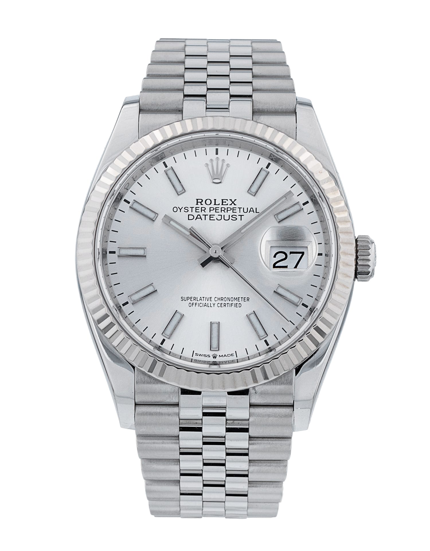 This Rolex Datejust 126234 has a silver baton dial and a bracelet strap. This Rolex has undergone a thorough inspection of water resistance, accuracy, functionality and condition to determine the level of reconditioning required to meet our strict standards. It has also been referenced against technical documents and manufacturer records where available to ensure authenticity and a clean history. All our watches have a 24-month warranty for your peace of mind. One of our skilled polishing technicians has removed marks on the case and bracelet of this watch, brought about by daily wear and tear, which is why this watch does not come with the remaining manufacturer’s warranty.
