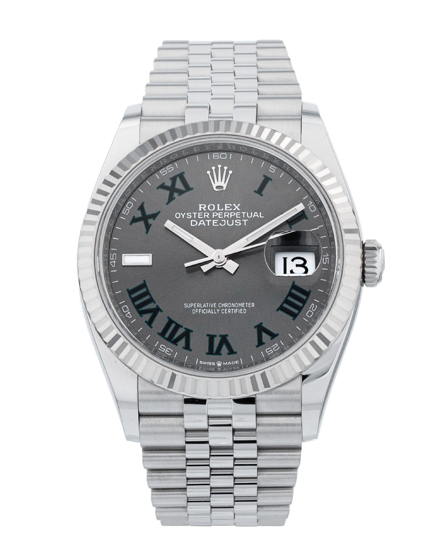 This Rolex Datejust 126234 has a slate roman numeral dial and a bracelet strap. This Rolex has undergone a thorough inspection of water resistance, accuracy, functionality and condition to determine the level of reconditioning required to meet our strict standards. It has also been referenced against technical documents and manufacturer records where available to ensure authenticity and a clean history. Our watches have a 24-month warranty for your peace of mind, in conjunction with any remaining manufacturer’s warranty from new or from service. To maintain the manufacturer’s warranty on this watch, it has not been polished in our service centre.