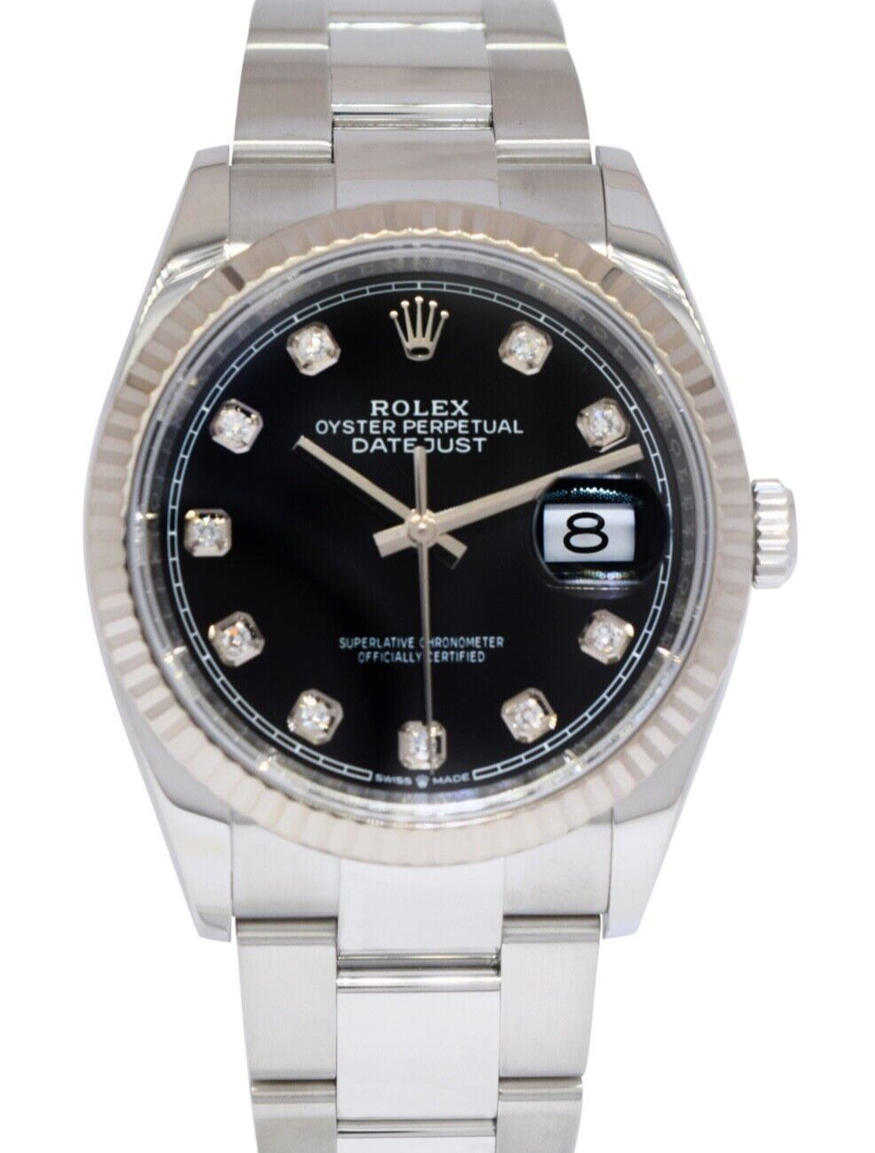 This Rolex Datejust 126234 has a black diamond dial and a bracelet strap. This Rolex has undergone a thorough inspection of water resistance, accuracy, functionality and condition to determine the level of reconditioning required to meet our strict standards. It has also been referenced against technical documents and manufacturer records where available to ensure authenticity and a clean history. All our watches have a 24-month warranty for your peace of mind. One of our skilled polishing technicians has removed marks on the case and bracelet of this watch, brought about by daily wear and tear, which is why this watch does not come with the remaining manufacturer’s warranty.