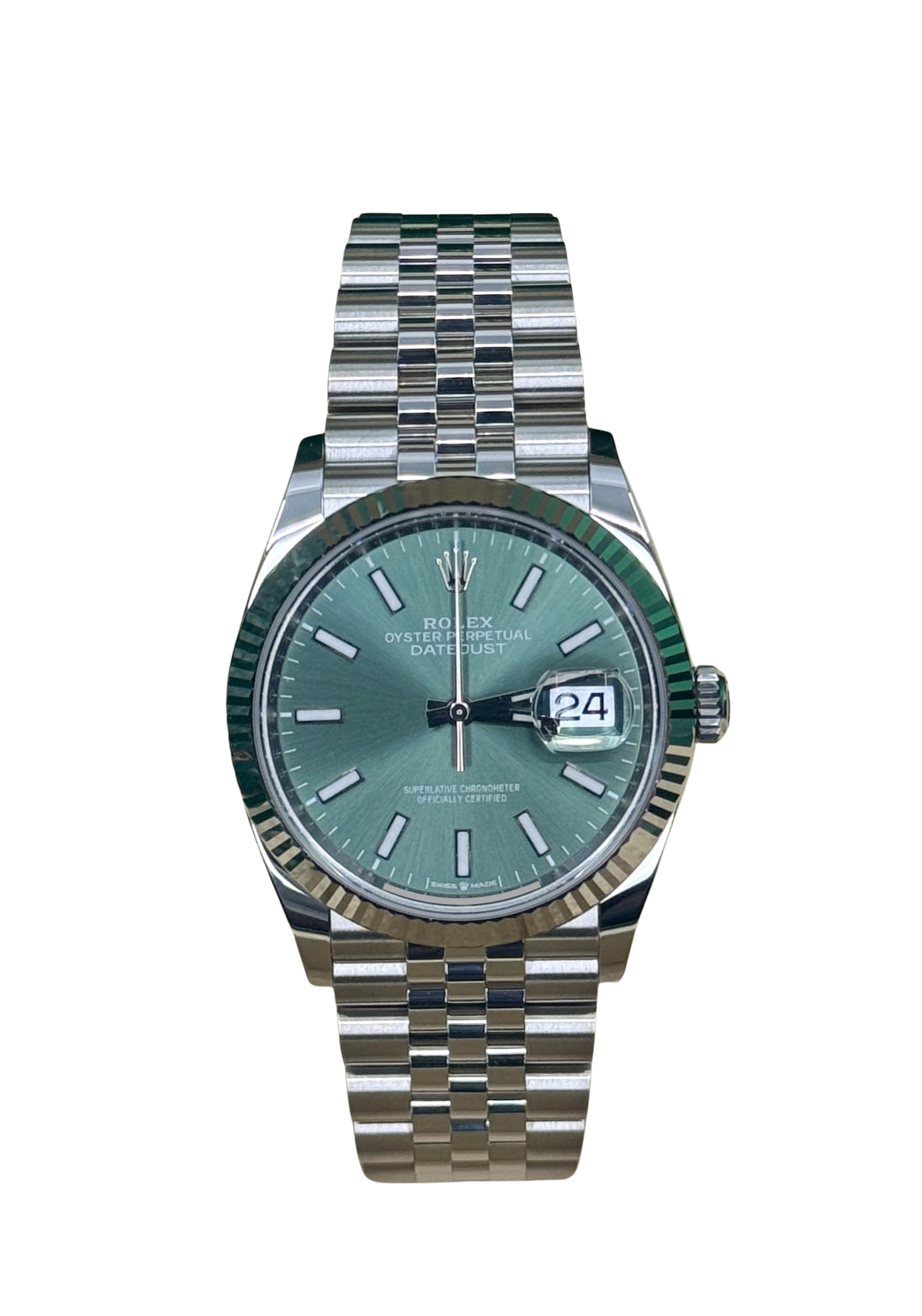 This Rolex Datejust 126234 has a mint green baton dial and a bracelet strap. This Rolex has undergone a thorough inspection of water resistance, accuracy, functionality and condition to determine the level of reconditioning required to meet our strict standards. It has also been referenced against technical documents and manufacturer records where available to ensure authenticity and a clean history. Our watches have a 24-month warranty for your peace of mind, in conjunction with any remaining manufacturer’s warranty from new or from service. To maintain the manufacturer’s warranty on this watch, it has not been polished in our service centre.