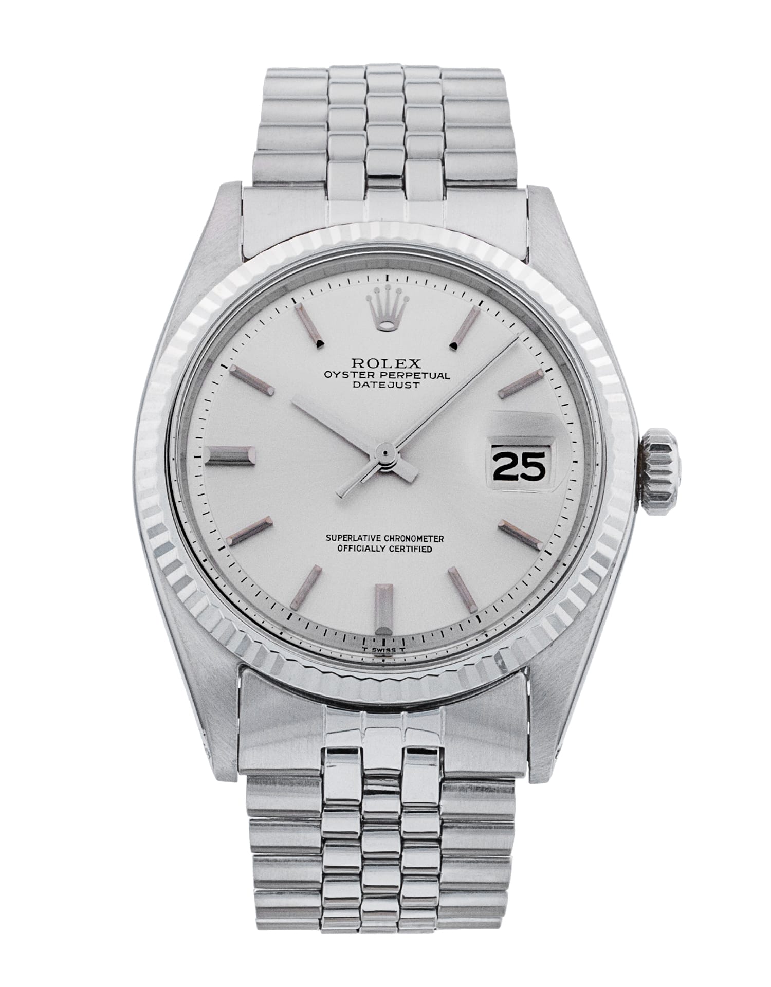 This Rolex Datejust 1601 has a silver baton dial and a bracelet strap. This Rolex has undergone a thorough inspection of accuracy, functionality and condition to determine the level of reconditioning required to meet our strict standards. It has also been referenced against technical documents and manufacturer records where available to ensure authenticity and a clean history. All our watches have a 24-month warranty for your peace of mind. One of our skilled polishing technicians has removed marks on the case and bracelet of this watch, brought about by daily wear and tear, which is why this watch does not come with the remaining manufacturer’s warranty.