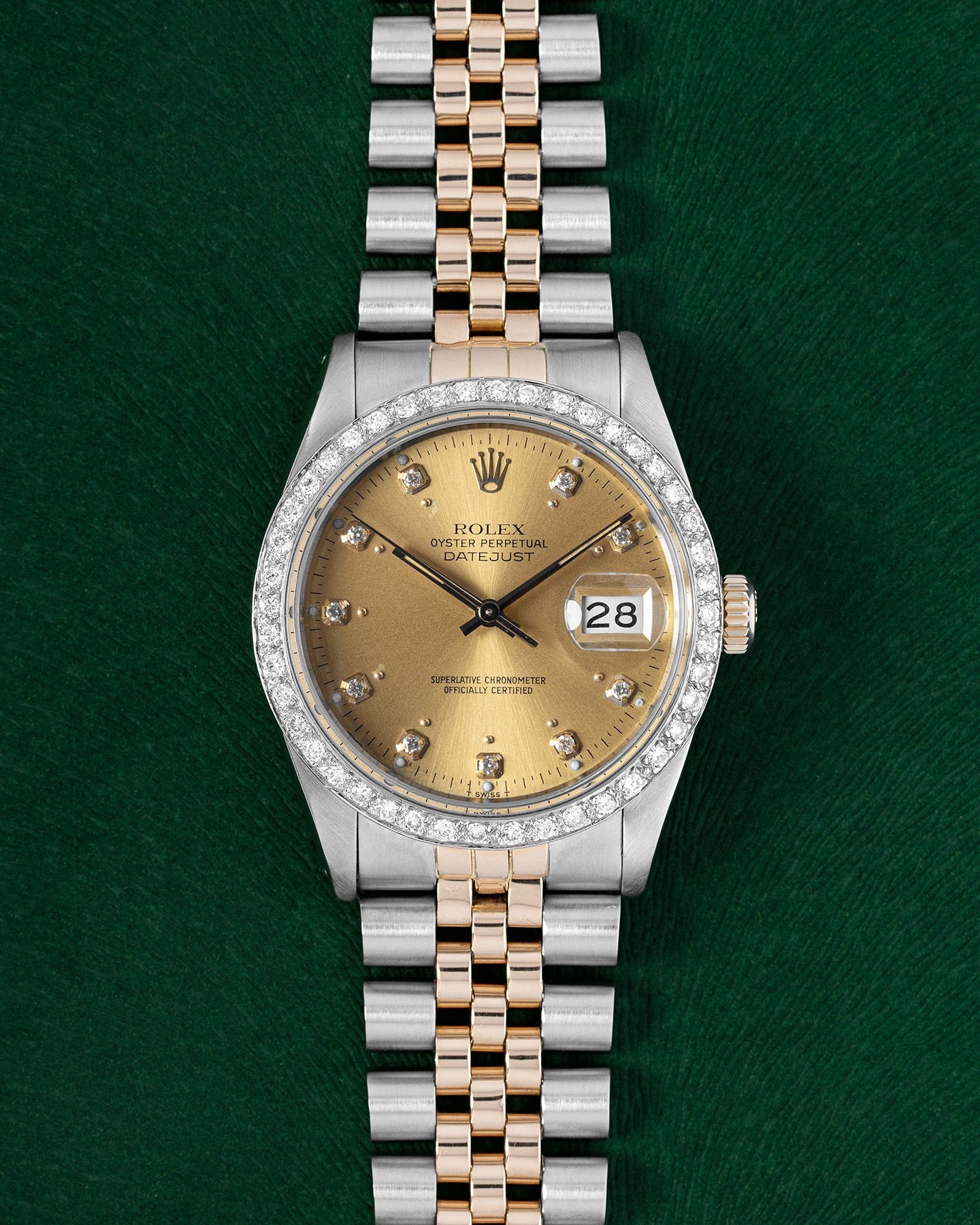 This Rolex Datejust 16013 has a champagne diamond dial and a bracelet strap. This Rolex has undergone a thorough inspection of water resistance, accuracy, functionality and condition to determine the level of reconditioning required to meet our strict standards. It has also been referenced against technical documents and manufacturer records where available to ensure authenticity and a clean history. All our watches have a 24-month warranty for your peace of mind. One of our skilled polishing technicians has removed marks on the case and bracelet of this watch, brought about by daily wear and tear, which is why this watch does not come with the remaining manufacturer’s warranty.