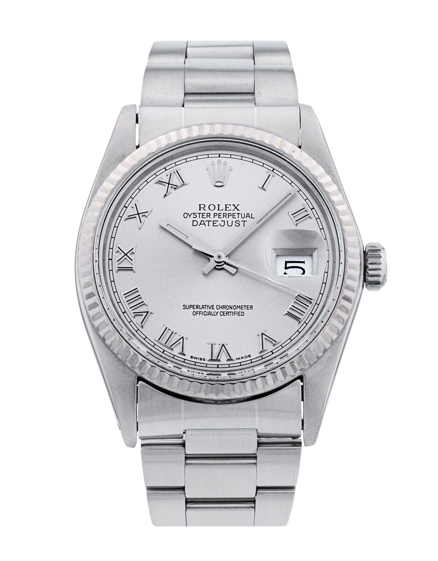 This Rolex Datejust 16014 has a silver roman numeral dial and a bracelet strap. This Rolex has undergone a thorough inspection of accuracy, functionality and condition to determine the level of reconditioning required to meet our strict standards. It has also been referenced against technical documents and manufacturer records where available to ensure authenticity and a clean history. All our watches have a 24-month warranty for your peace of mind. One of our skilled polishing technicians has removed marks on the case and bracelet of this watch, brought about by daily wear and tear, which is why this watch does not come with the remaining manufacturer’s warranty.