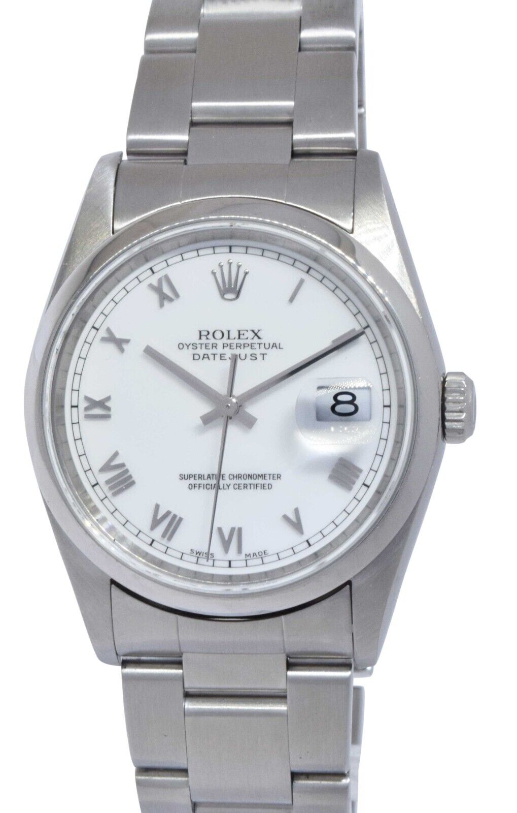 This Rolex Datejust 16200 has a white roman numeral dial and a bracelet strap. This Rolex has undergone a thorough inspection of water resistance, accuracy, functionality and condition to determine the level of reconditioning required to meet our strict standards. It has also been referenced against technical documents and manufacturer records where available to ensure authenticity and a clean history. All our watches have a 24-month warranty for your peace of mind. One of our skilled polishing technicians has removed marks on the case and bracelet of this watch, brought about by daily wear and tear, which is why this watch does not come with the remaining manufacturer’s warranty.
