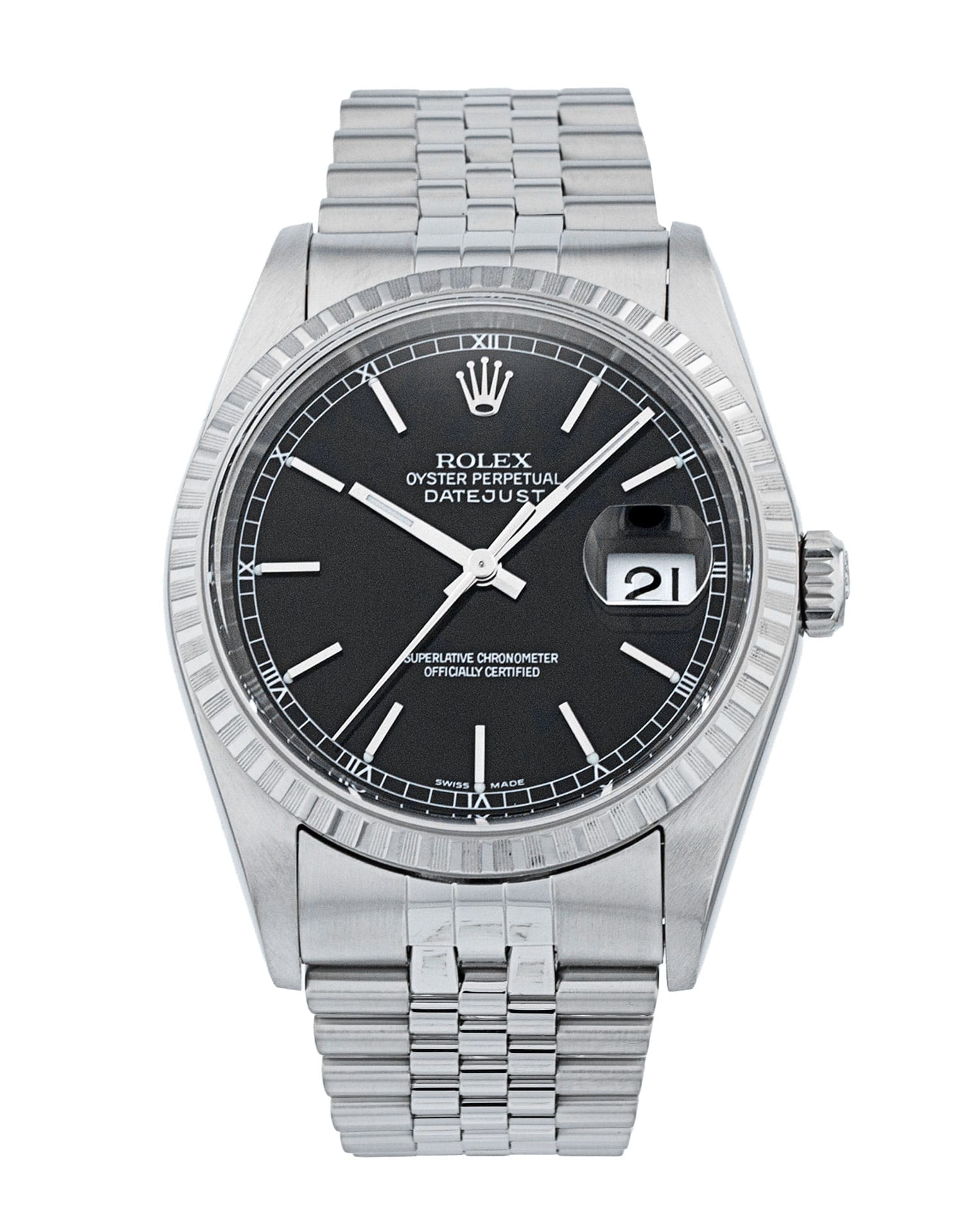 This Rolex Datejust 16220 has a black baton - roman numeral dial and a bracelet strap. This Rolex has undergone a thorough inspection of water resistance, accuracy, functionality and condition to determine the level of reconditioning required to meet our strict standards. It has also been referenced against technical documents and manufacturer records where available to ensure authenticity and a clean history. All our watches have a 24-month warranty for your peace of mind. One of our skilled polishing technicians has removed marks on the case and bracelet of this watch, brought about by daily wear and tear, which is why this watch does not come with the remaining manufacturer’s warranty.