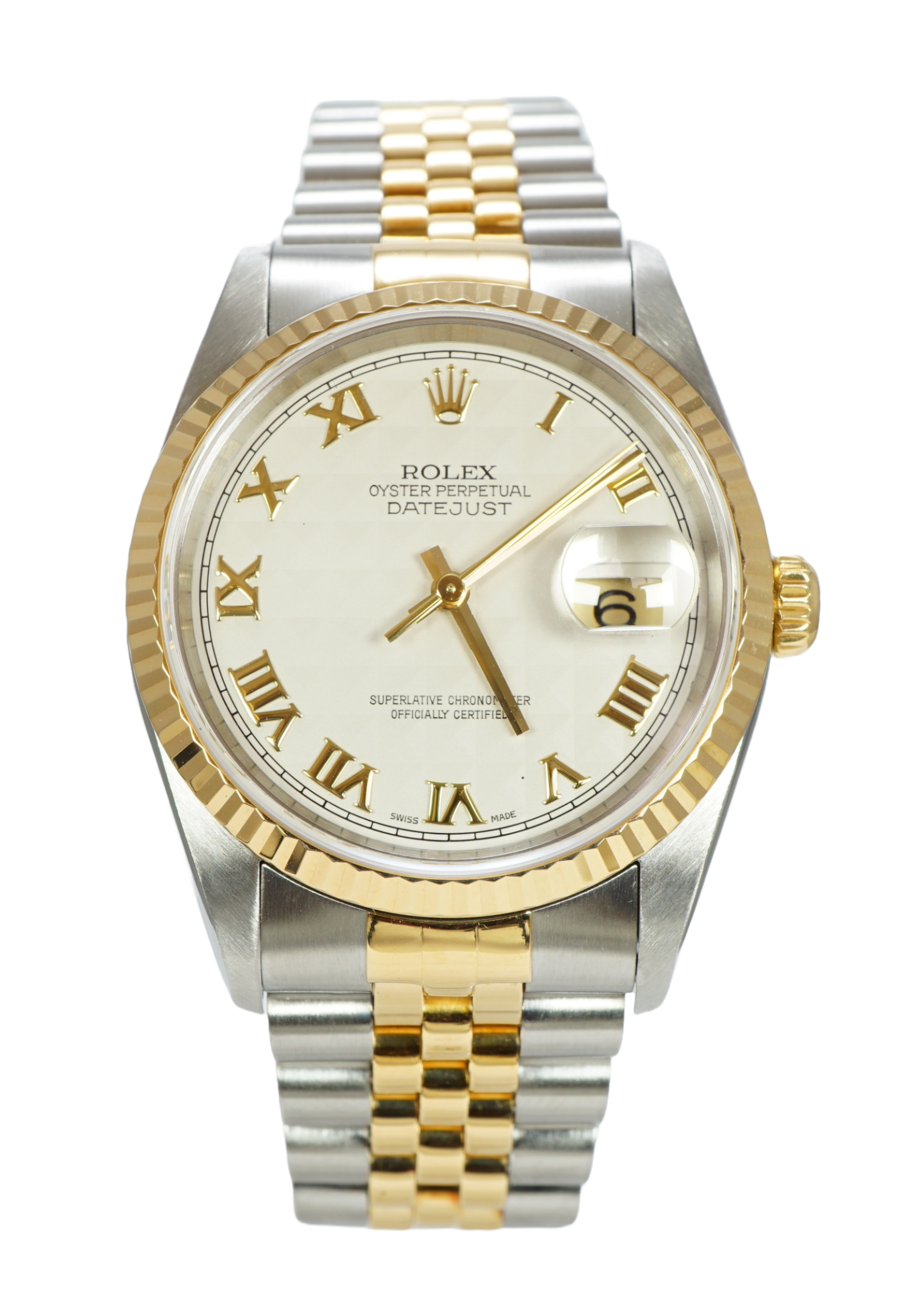 This Rolex Datejust 16233 has a ivory pyramid roman numeral dial and a bracelet strap. This Rolex has undergone a thorough inspection of water resistance, accuracy, functionality and condition to determine the level of reconditioning required to meet our strict standards. It has also been referenced against technical documents and manufacturer records where available to ensure authenticity and a clean history. All our watches have a 24-month warranty for your peace of mind. One of our skilled polishing technicians has removed marks on the case and bracelet of this watch, brought about by daily wear and tear, which is why this watch does not come with the remaining manufacturer’s warranty.