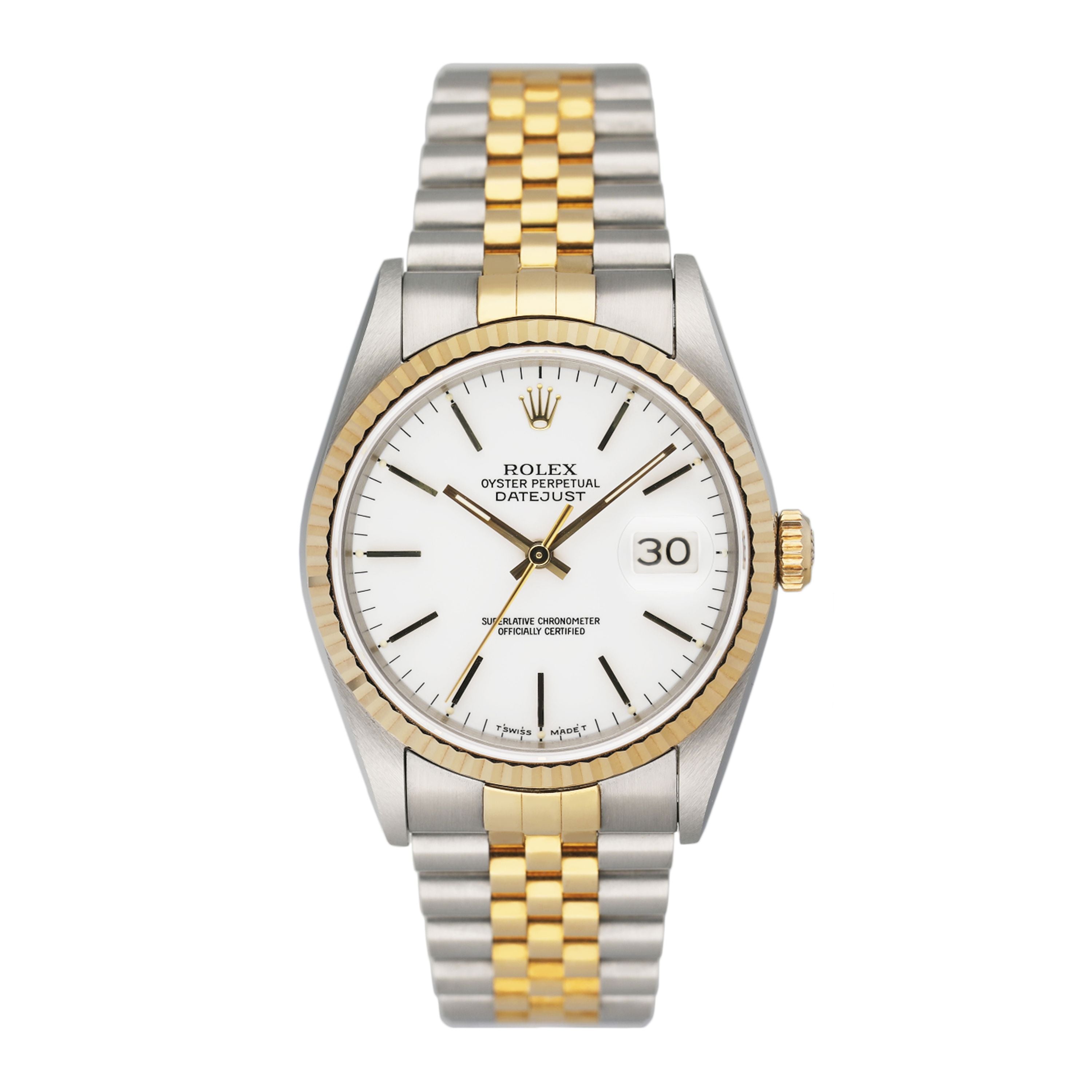 This Rolex Datejust 16233 has a white baton dial and a bracelet strap. This Rolex has undergone a thorough inspection of water resistance, accuracy, functionality and condition to determine the level of reconditioning required to meet our strict standards. It has also been referenced against technical documents and manufacturer records where available to ensure authenticity and a clean history. All our watches have a 24-month warranty for your peace of mind. One of our skilled polishing technicians has removed marks on the case and bracelet of this watch, brought about by daily wear and tear, which is why this watch does not come with the remaining manufacturer’s warranty.