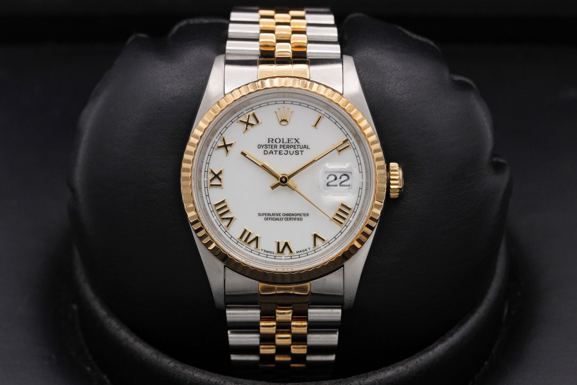 This Rolex Datejust 16233 has a white roman numeral dial and a bracelet strap. This Rolex has undergone a thorough inspection of water resistance, accuracy, functionality and condition to determine the level of reconditioning required to meet our strict standards. It has also been referenced against technical documents and manufacturer records where available to ensure authenticity and a clean history. All our watches have a 24-month warranty for your peace of mind. One of our skilled polishing technicians has removed marks on the case and bracelet of this watch, brought about by daily wear and tear, which is why this watch does not come with the remaining manufacturer’s warranty.