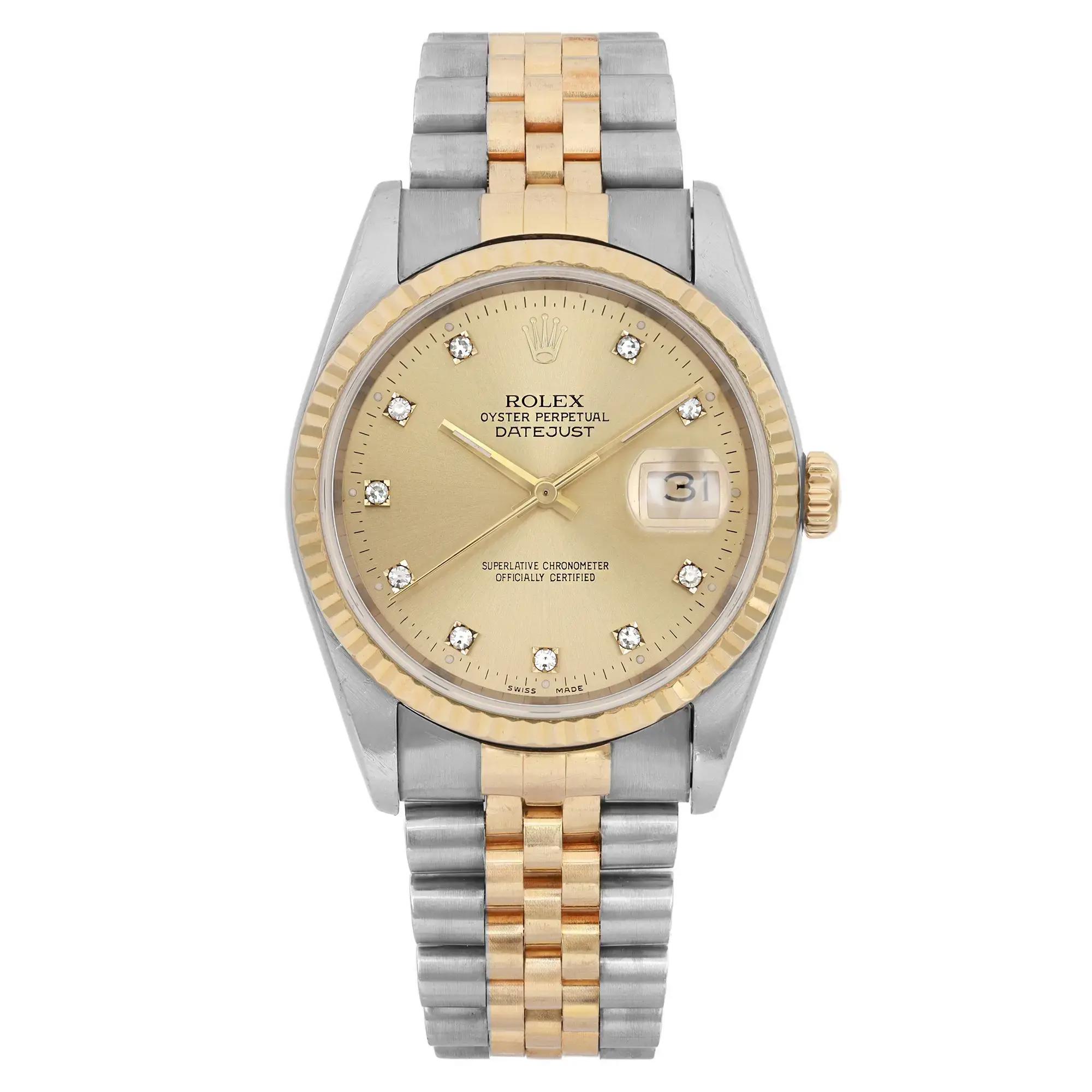 This Rolex Datejust 16233 has a champagne diamond dial and a bracelet strap. This Rolex has undergone a thorough inspection of water resistance, accuracy, functionality and condition to determine the level of reconditioning required to meet our strict standards. It has also been referenced against technical documents and manufacturer records where available to ensure authenticity and a clean history. All our watches have a 24-month warranty for your peace of mind. One of our skilled polishing technicians has removed marks on the case and bracelet of this watch, brought about by daily wear and tear, which is why this watch does not come with the remaining manufacturer’s warranty.