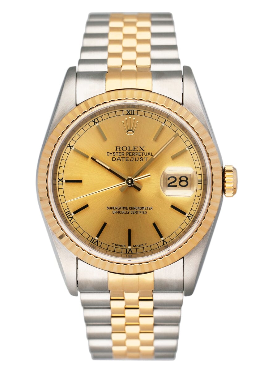 This Rolex Datejust 16233 has a champagne baton dial and a bracelet strap. This Rolex has undergone a thorough inspection of water resistance, accuracy, functionality and condition to determine the level of reconditioning required to meet our strict standards. It has also been referenced against technical documents and manufacturer records where available to ensure authenticity and a clean history. All our watches have a 24-month warranty for your peace of mind. One of our skilled polishing technicians has removed marks on the case and bracelet of this watch, brought about by daily wear and tear, which is why this watch does not come with the remaining manufacturer’s warranty.