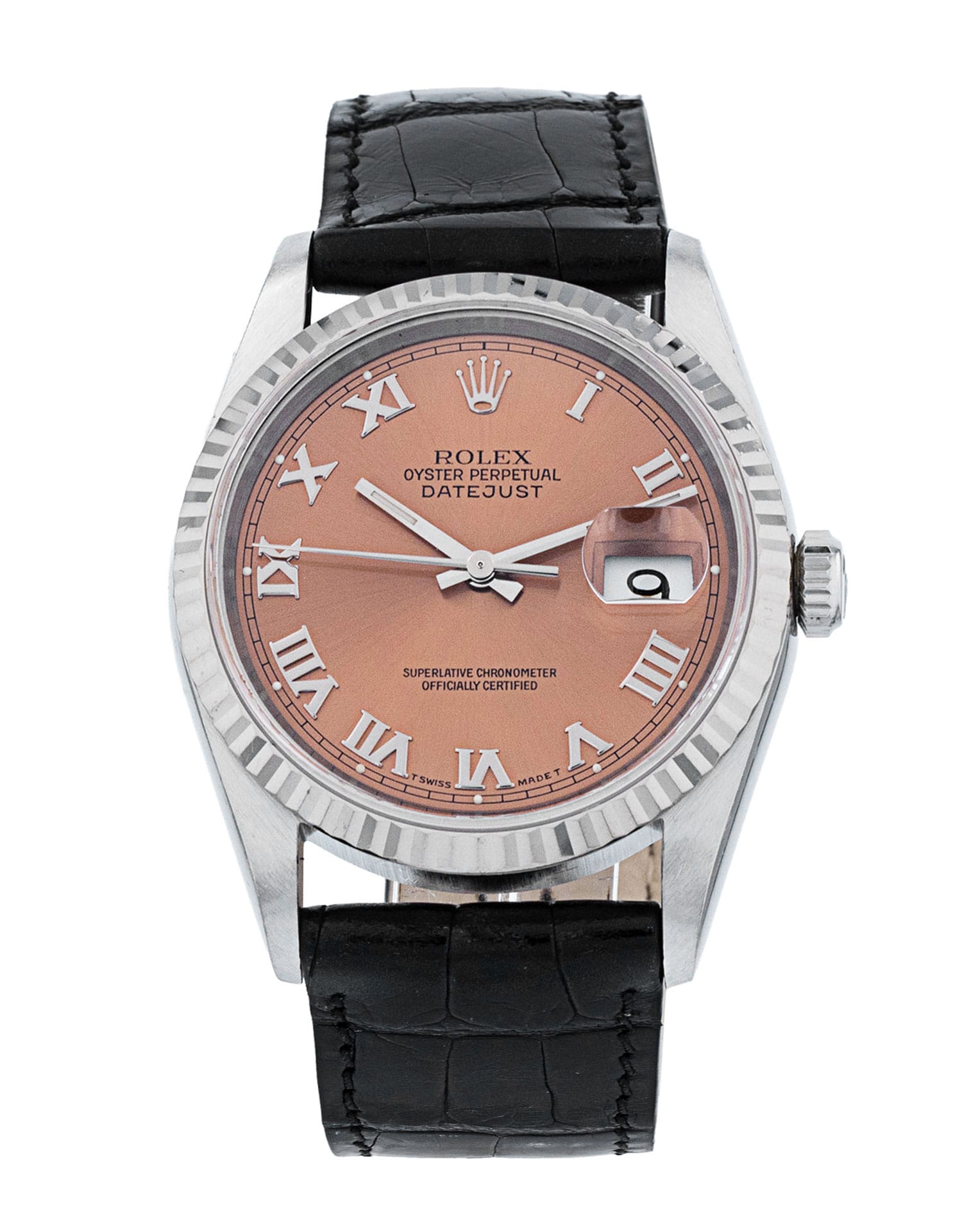 This Rolex Datejust 16234 has a salmon roman numeral dial and a leather strap. This Rolex has undergone a thorough inspection of water resistance, accuracy, functionality and condition to determine the level of reconditioning required to meet our strict standards. It has also been referenced against technical documents and manufacturer records where available to ensure authenticity and a clean history. Our watches have a 24-month warranty for your peace of mind, in conjunction with any remaining manufacturer’s warranty from new or from service. To maintain the manufacturer’s warranty on this watch, it has not been polished in our service centre.