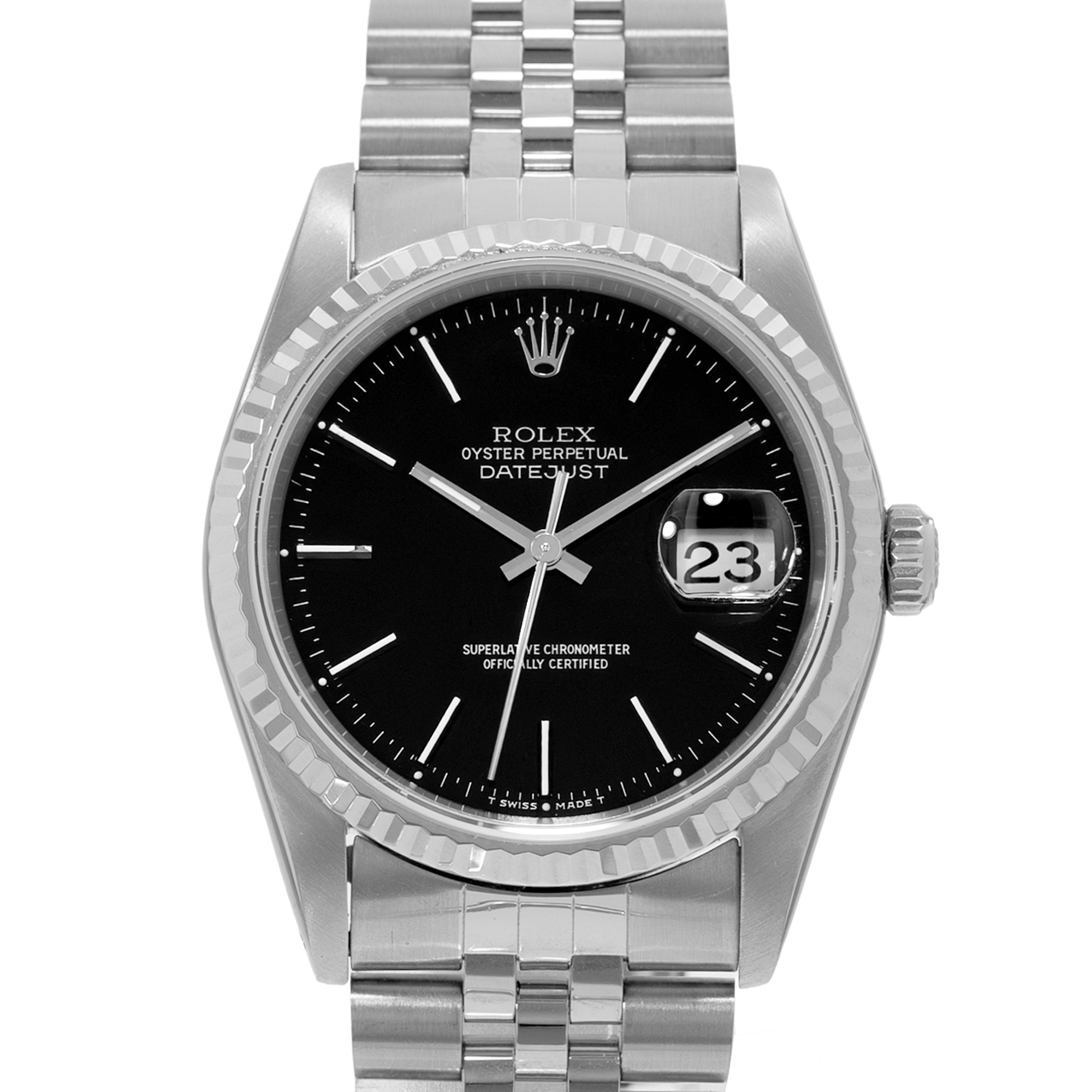 This Rolex Datejust 16234 has a black baton dial and a bracelet strap. This Rolex has undergone a thorough inspection of water resistance, accuracy, functionality and condition to determine the level of reconditioning required to meet our strict standards. It has also been referenced against technical documents and manufacturer records where available to ensure authenticity and a clean history. All our watches have a 24-month warranty for your peace of mind. One of our skilled polishing technicians has removed marks on the case and bracelet of this watch, brought about by daily wear and tear, which is why this watch does not come with the remaining manufacturer’s warranty.