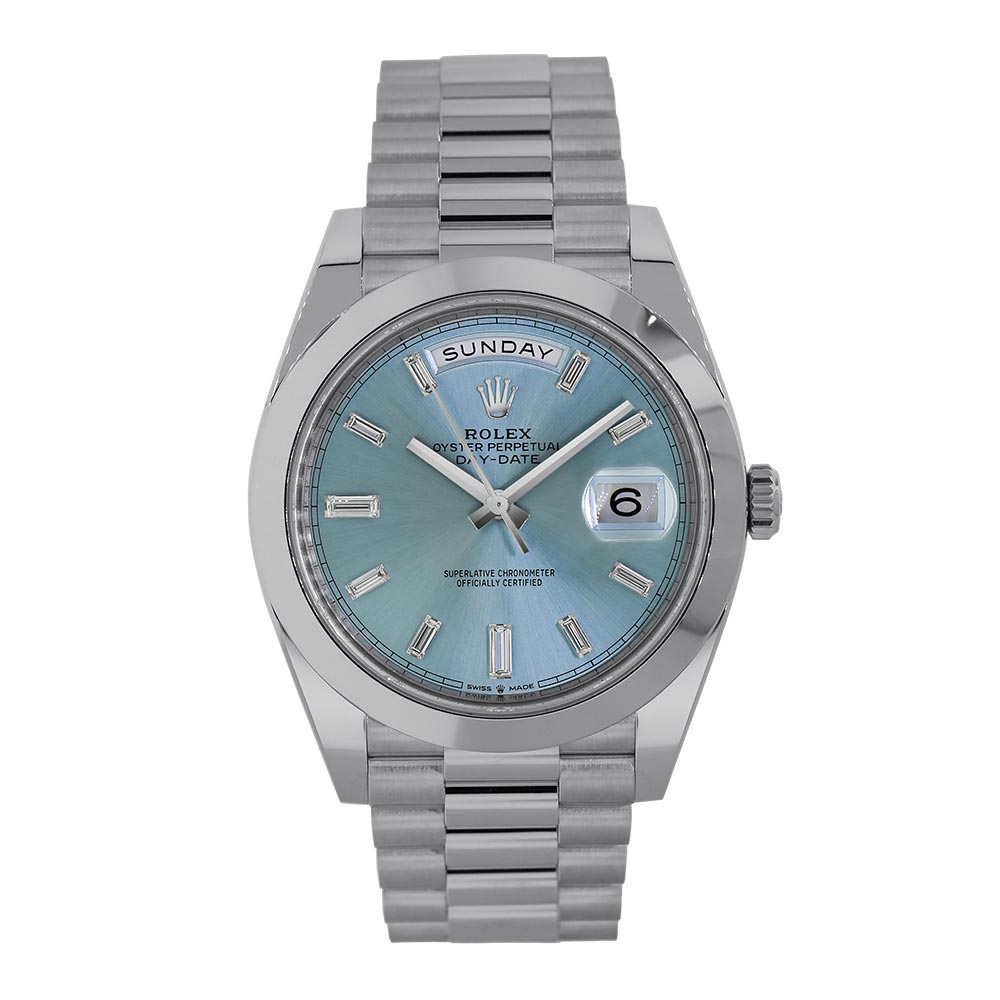 This Rolex Day-Date 40 228206 has a ice blue diagonal motif dial and a bracelet strap. This Rolex has undergone a thorough inspection of water resistance, accuracy, functionality and condition to determine the level of reconditioning required to meet our strict standards. It has also been referenced against technical documents and manufacturer records where available to ensure authenticity and a clean history. Our watches have a 24-month warranty for your peace of mind, in conjunction with any remaining manufacturer’s warranty from new or from service. To maintain the manufacturer’s warranty on this watch, it has not been polished in our service centre.