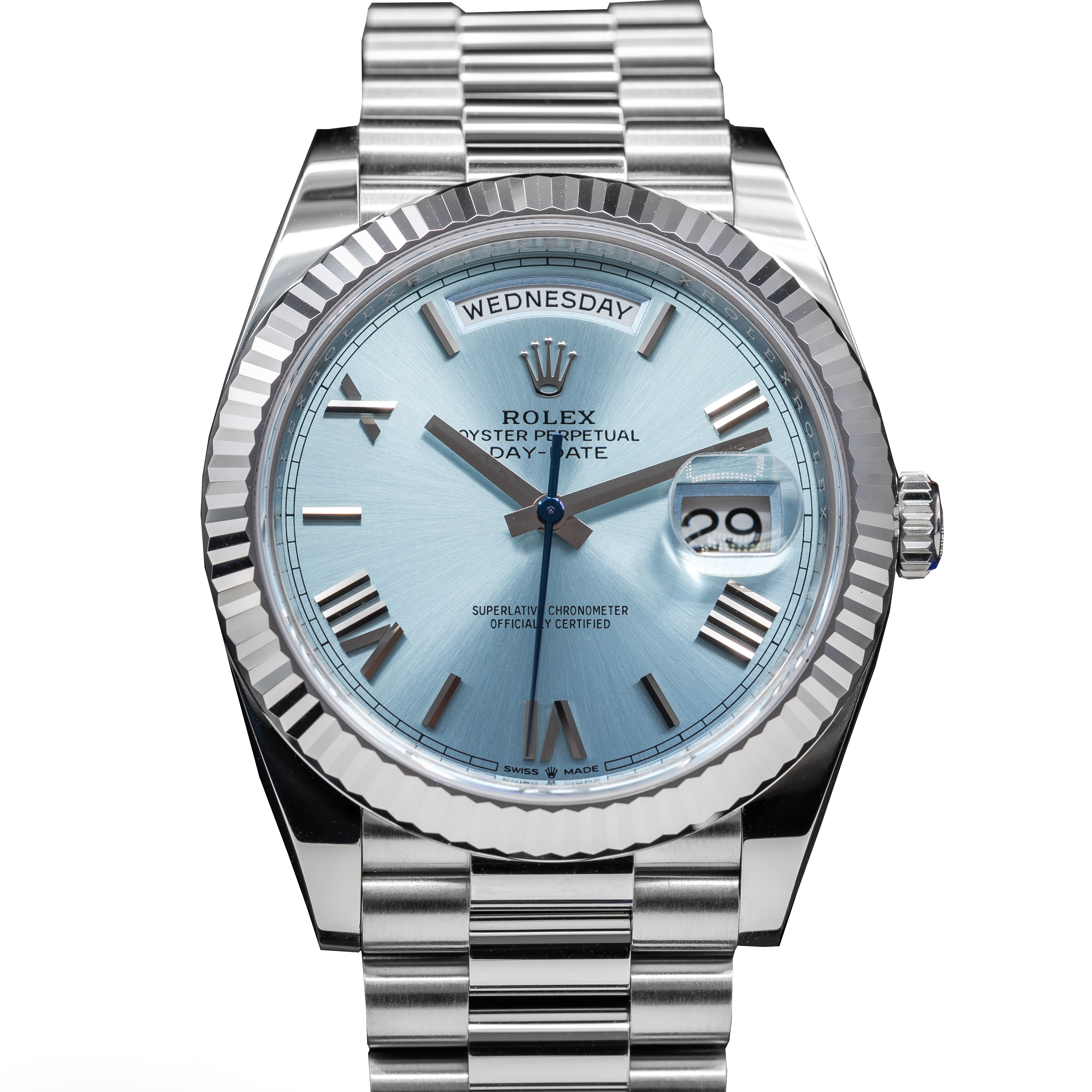 This Rolex Day-Date 40 228236 has a ice blue roman numeral dial and a bracelet strap. This Rolex has undergone a thorough inspection of water resistance, accuracy, functionality and condition to determine the level of reconditioning required to meet our strict standards. It has also been referenced against technical documents and manufacturer records where available to ensure authenticity and a clean history. Our watches have a 24-month warranty for your peace of mind, in conjunction with any remaining manufacturer’s warranty from new or from service. To maintain the manufacturer’s warranty on this watch, it has not been polished in our service centre.