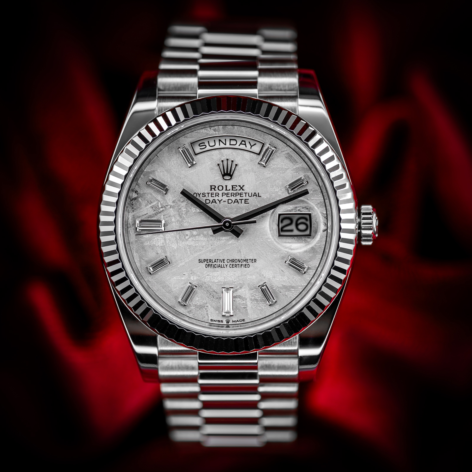 This Rolex Day-Date 40 228236 has a meteorite diamond dial and a bracelet strap. This Rolex has undergone a thorough inspection of water resistance, accuracy, functionality and condition to determine the level of reconditioning required to meet our strict standards. It has also been referenced against technical documents and manufacturer records where available to ensure authenticity and a clean history. Our watches have a 24-month warranty for your peace of mind, in conjunction with any remaining manufacturer’s warranty from new or from service. To maintain the manufacturer’s warranty on this watch, it has not been polished in our service centre.