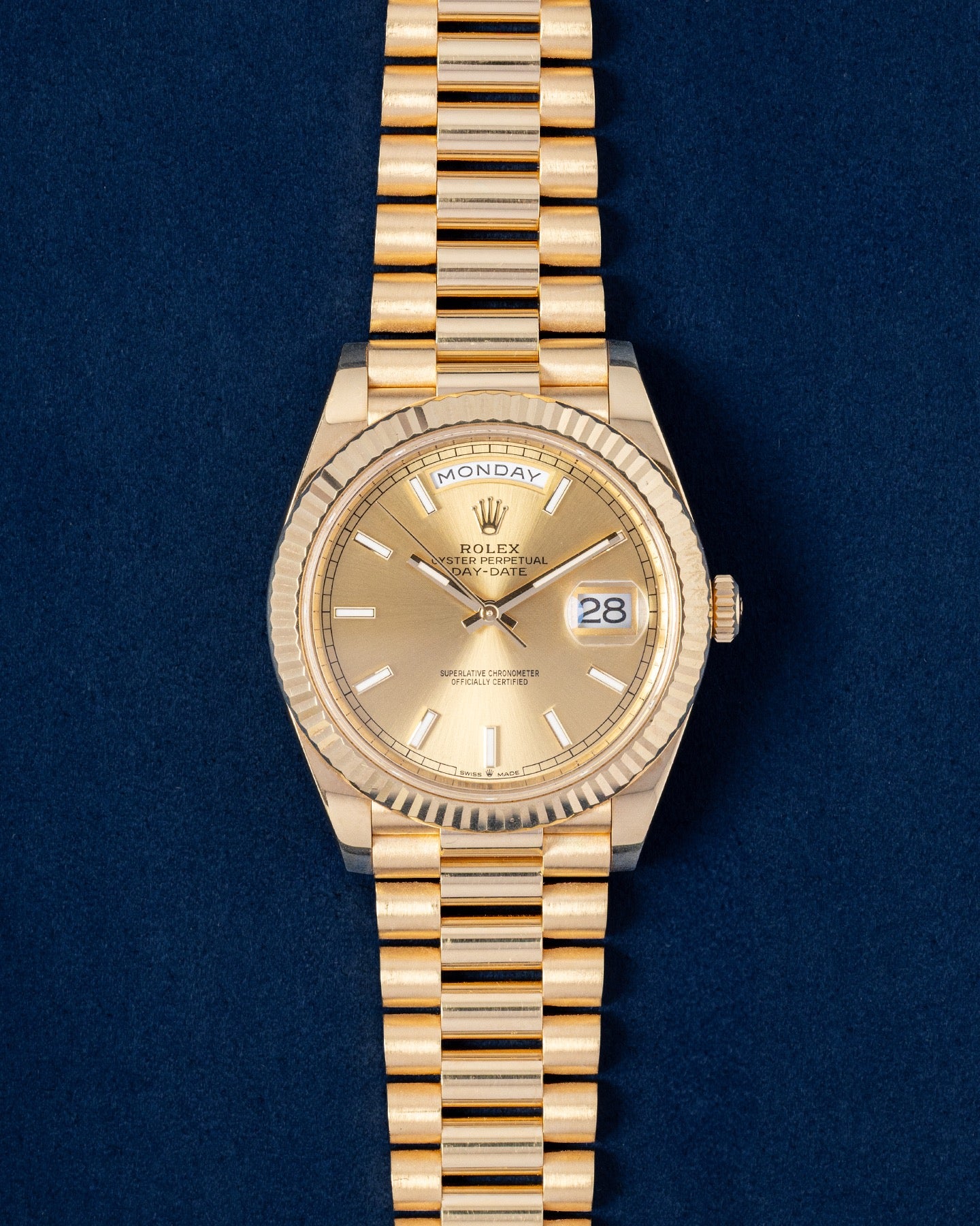 This Rolex Day-Date 40 228238 has a champagne baton dial and a bracelet strap. This Rolex has undergone a thorough inspection of water resistance, accuracy, functionality and condition to determine the level of reconditioning required to meet our strict standards. It has also been referenced against technical documents and manufacturer records where available to ensure authenticity and a clean history. All our watches have a 24-month warranty for your peace of mind. One of our skilled polishing technicians has removed marks on the case and bracelet of this watch, brought about by daily wear and tear, which is why this watch does not come with the remaining manufacturer’s warranty.